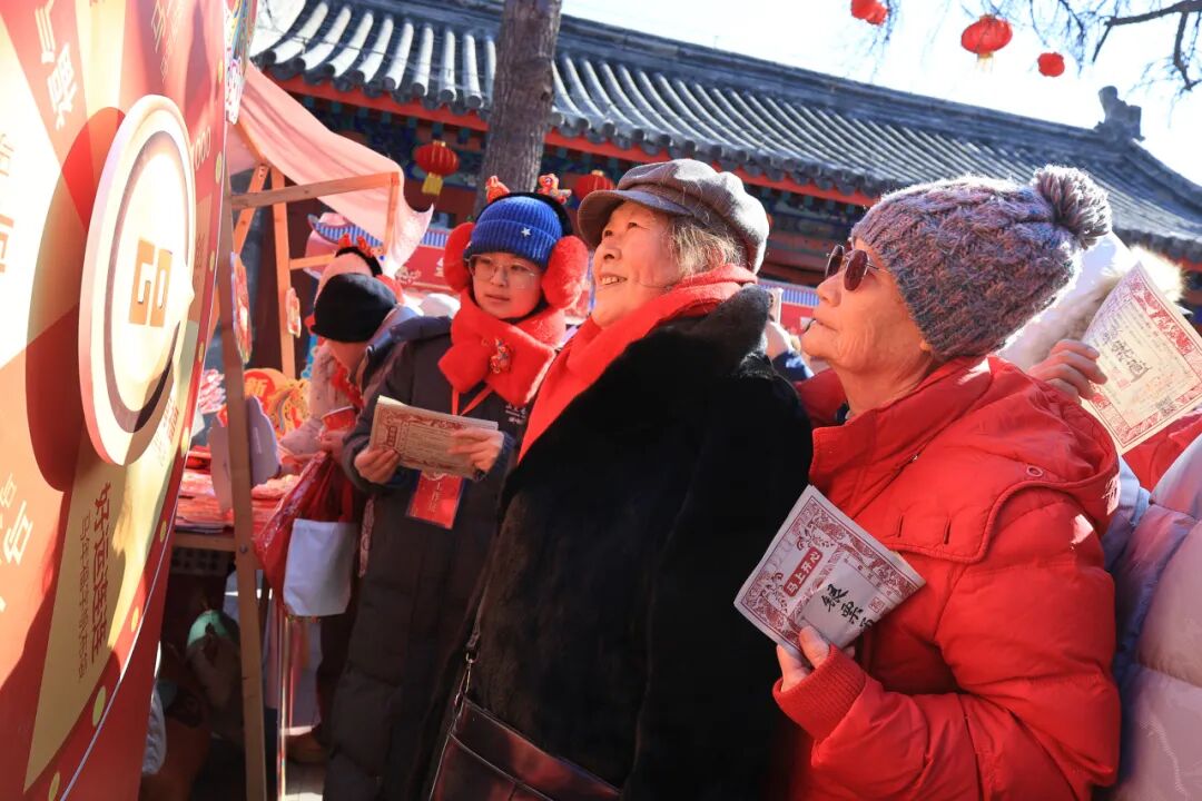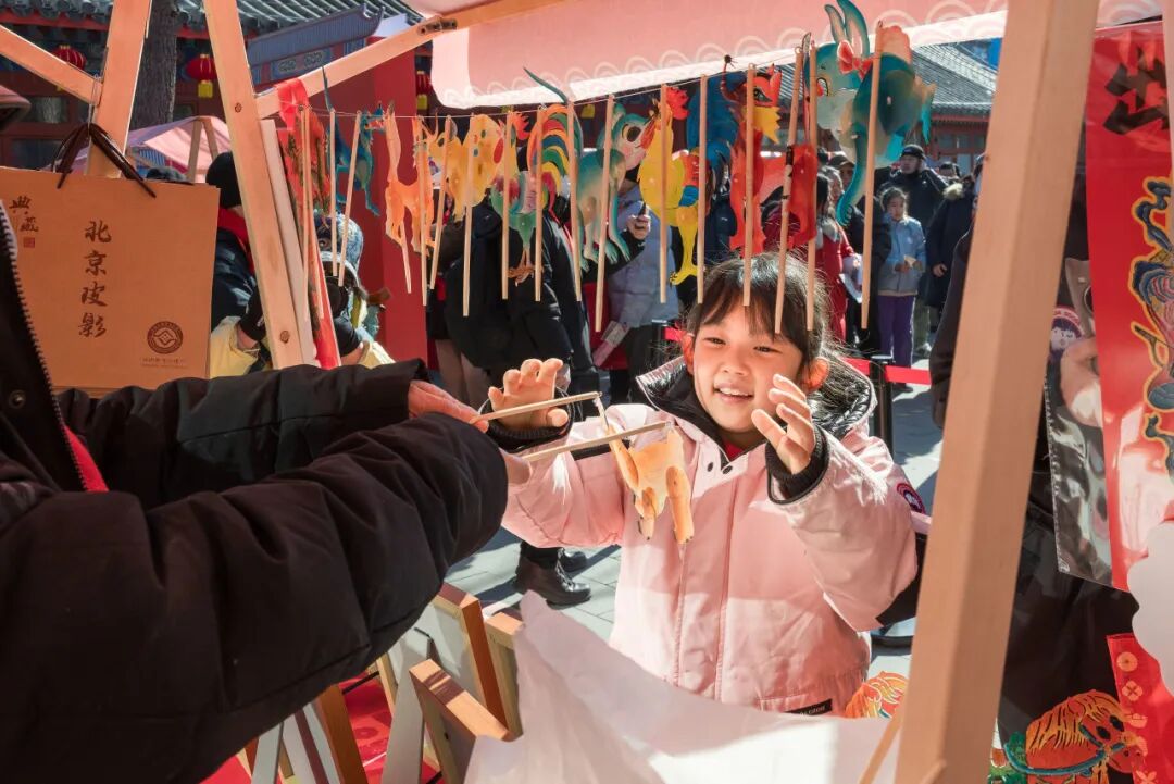 作为非遗体验的主阵地,“非遗立方首店”在此扎根,集中展示并首发内联升布鞋、瑞蚨祥丝绸等非遗老字号文创新品;“马上有戏”专区每日上演皮影戏(北京皮影戏)、双簧、穆派戏法等非遗项目;“马上甜蜜”专区首次联动北京坊巧克巧蔻-巧克力博物馆来到现场为大家送上甜蜜祝福,同时还供应徐福记、德芙等品牌糖果,价格惠民;火神庙内开展飞花令、猜谜等互动游戏,市民凭“银票通”(通过对诗、问答获取)可兑换文创礼品。