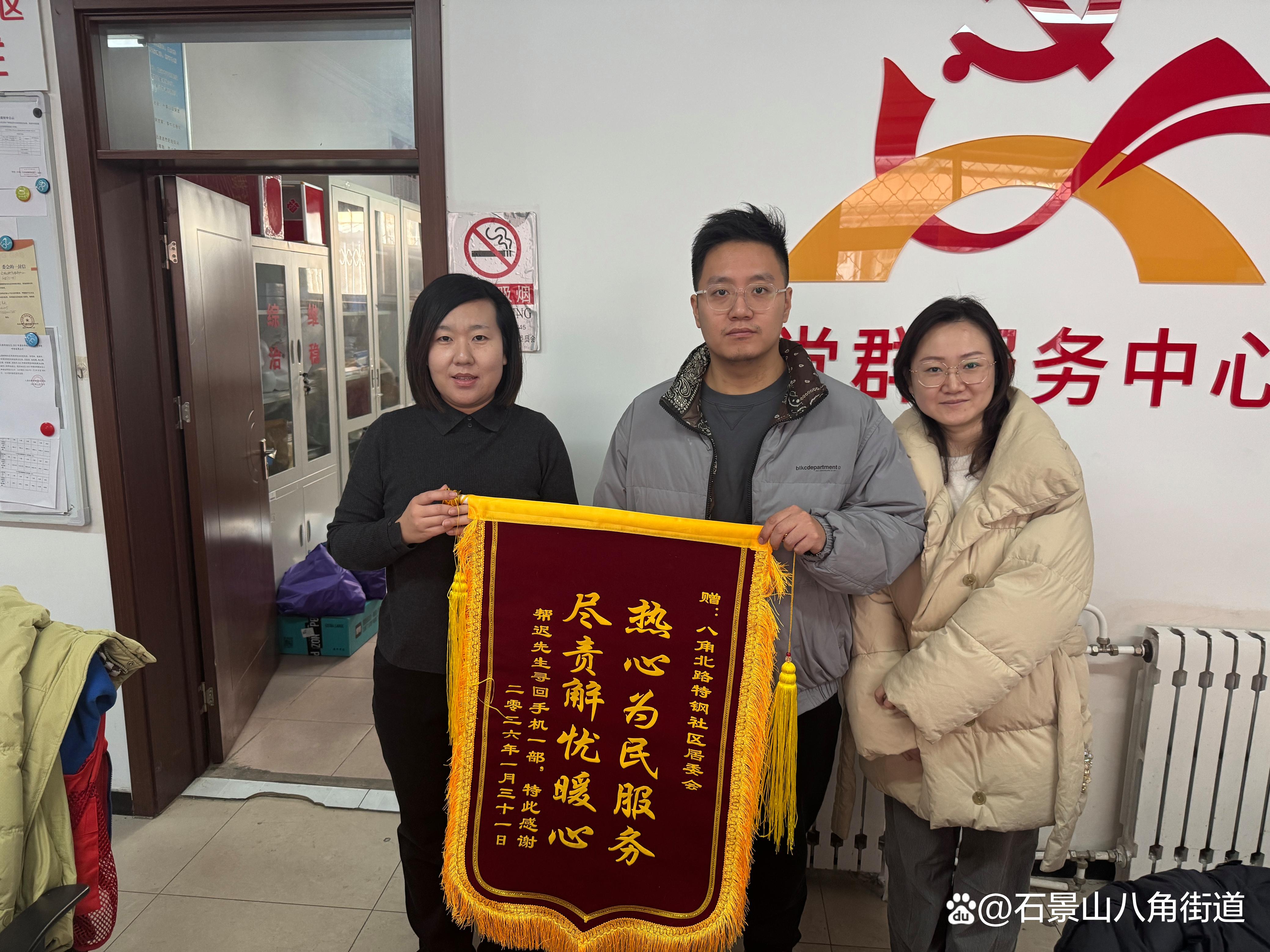 近日,八角北路特钢社区发生了一件暖心之事,海淀区玉泉路的迟先生及其家属专程来到社区,送上一面印有“热心为民服务 尽责解忧暖心”的锦旗,对社区工作人员高效帮助寻回遗失手机表达诚挚感激。