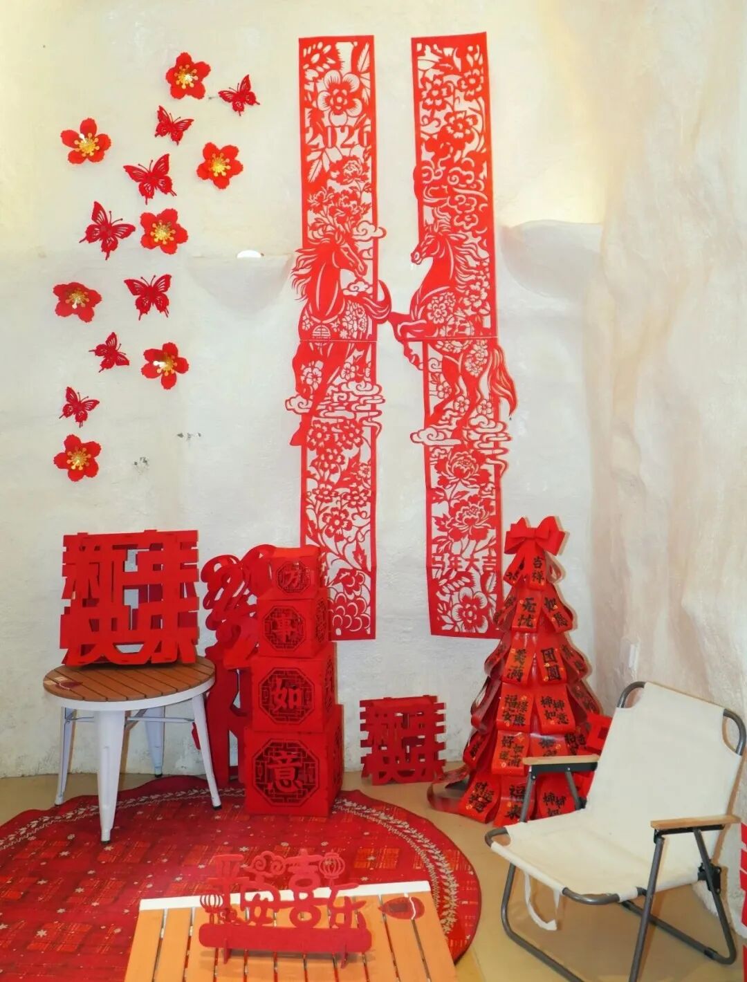 西三村的红栗子咖啡店,新春的暖意同样浸润在细节中。店内用印着“无忧”“吉祥”“团圆”等字样的红色纸张,拼搭出新春小树造型,与印有马踏祥云图案的拉花剪纸相映成趣,烘托出喜庆氛围。同时,店里还推出了两款新春特饮:柿柿如意拿铁和红果柿子茉莉冰茶,将传统年味与现代咖啡风味巧妙结合。