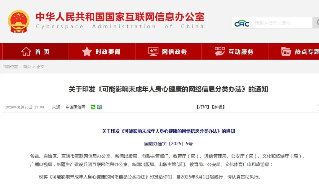 近日,国家互联网信息办公室、国家新闻出版署、国家电影局、教育部、工业和信息化部、公安部、文化和旅游部、国家广播电视总局发布《可能影响未成年人身心健康的网络信息分类办法》(以下简称《办法》),自2026年3月1日起施行。一起来看↓↓↓