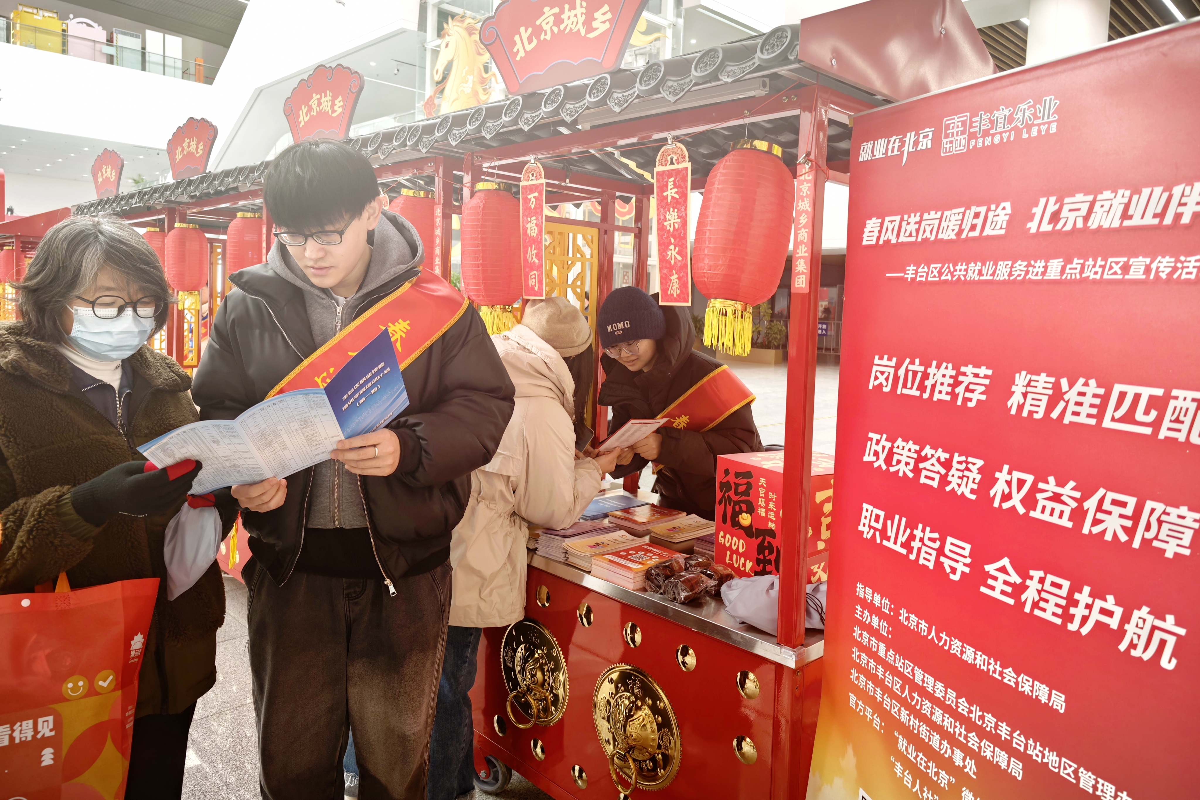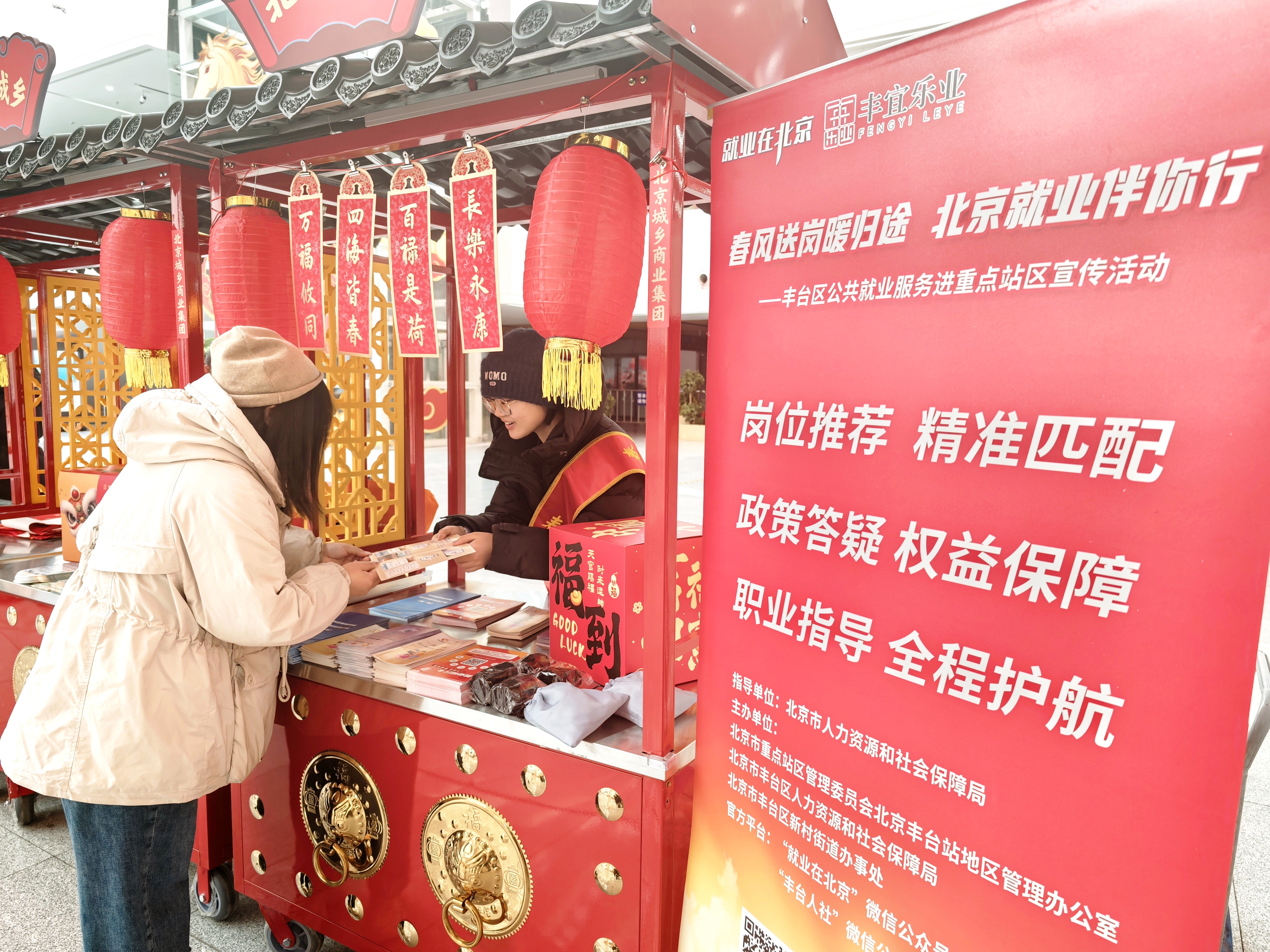 “一进车站就收到了就业服务礼包,既有实用物资,又有详细的岗位和政策信息,丰台这波服务太及时了!”2月9日,北京丰台站的春运人流中,一场以“春风送岗暖归途、北京就业伴你行”为主题的就业服务宣传活动温情启幕。随着2026年春运大幕拉开,丰台区人力社保局精准把握出行节律,联合西罗园街道办事处、新村街道办事处,在北京南站、北京丰台站两大交通枢纽精准布局服务点位,将岗位资源、政策红利与咨询服务送到旅客身边,让春运旅途与就业之路无缝衔接。