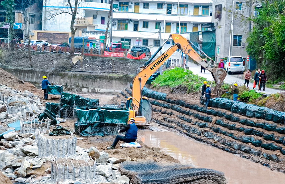 水利是民生命脉,生态是发展底色。2月5日,在营山县双流镇双河河河道治理工程施工现场,一派热火朝天的忙碌景象,工人们正有条不紊地开展PET生态护坡作业,搅拌材料、铺设护坡结构、夯实加固,每一道工序都严谨细致,全力推进工程建设。
