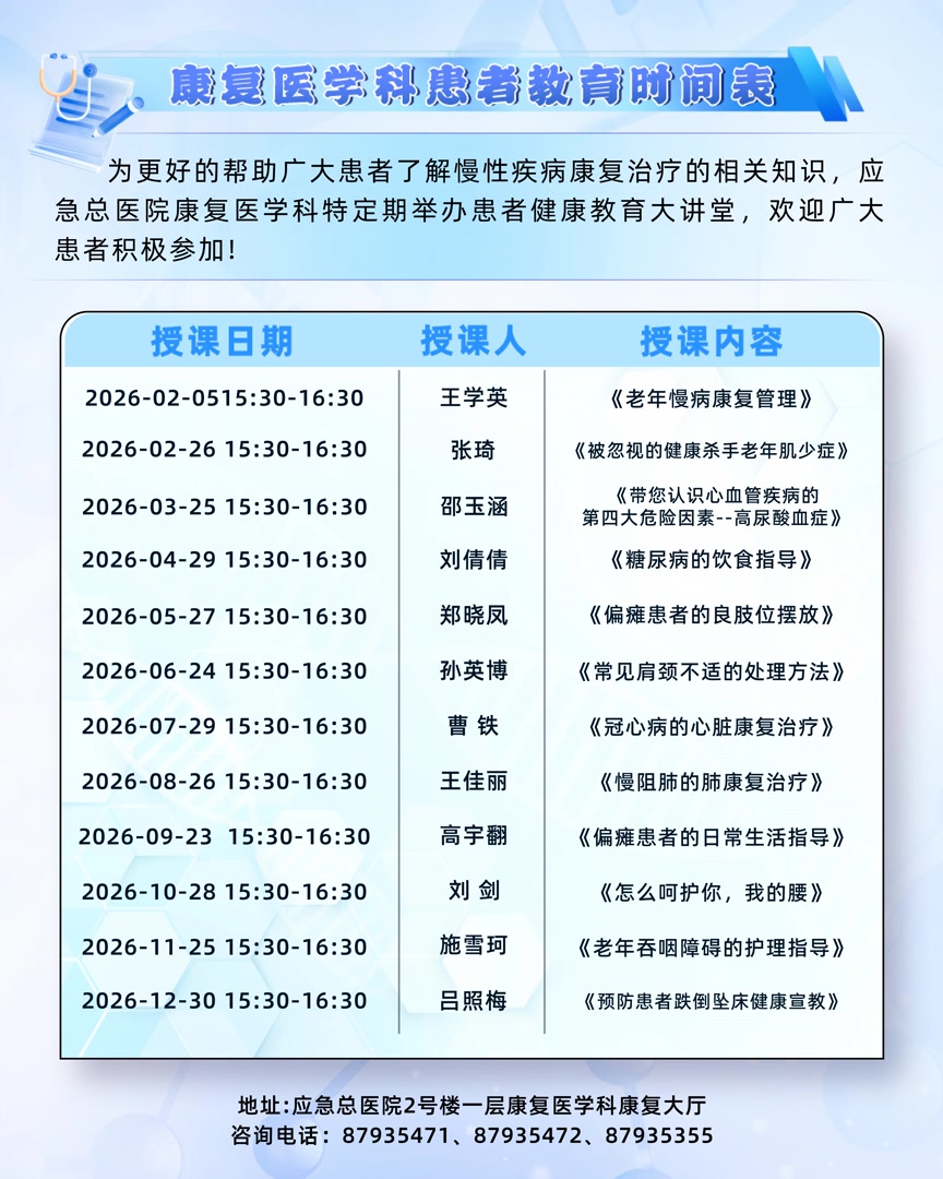 应急总医院康复医学科为提升广大患者对慢性疾病康复治疗的认知,特推出患者健康教育大讲堂系列活动,并公布了详细的时间表。