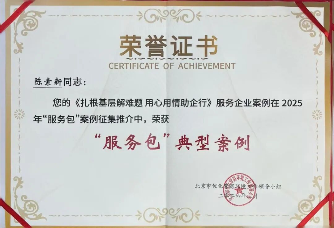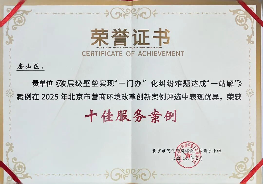 近日,市发改委举办“政企协同·共‘营’未来——北京优化营商环境年度大会”。我区营商环境改革案例《破层级壁垒实现“一门办” 化纠纷难题达成“一站解”》和服务企业案例《扎根基层解难题 用心用情助企行》,分别荣获2025年北京市“营商环境改革创新十佳服务案例”和“‘服务包’典型案例”。