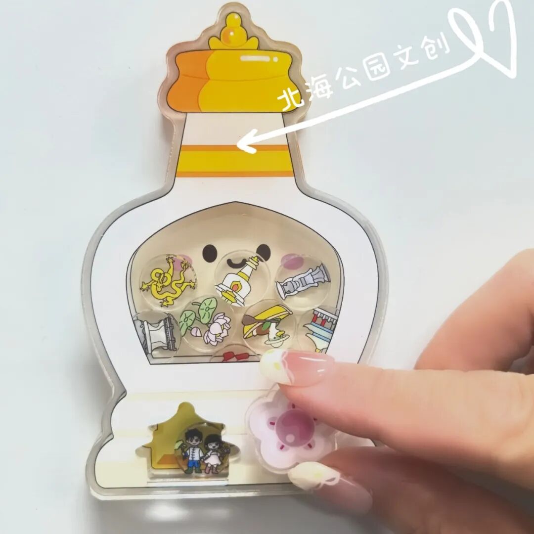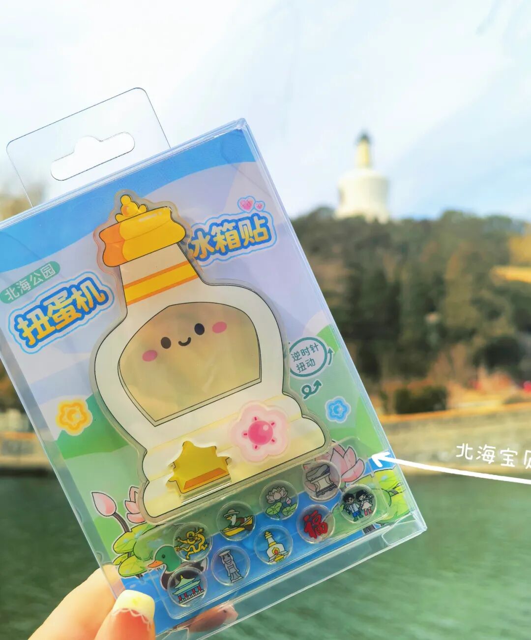 北海公园全新推出文创新品白塔扭蛋机冰箱贴,创意以园内标志性建筑 —— 北海白塔为设计原型,采用高透亚克力材质打造,10cm×6.4cm 的精巧尺寸,色彩鲜亮、质感通透,可长久保存,扭蛋机内包含了北海公园白塔、五龙亭的龙泽亭、铜仙承露盘、九龙壁的盘龙、阐福寺乾隆御笔福字、团城玉瓮、一园一品荷花、绿头鸭手划船以及北海宝贝IP形象。