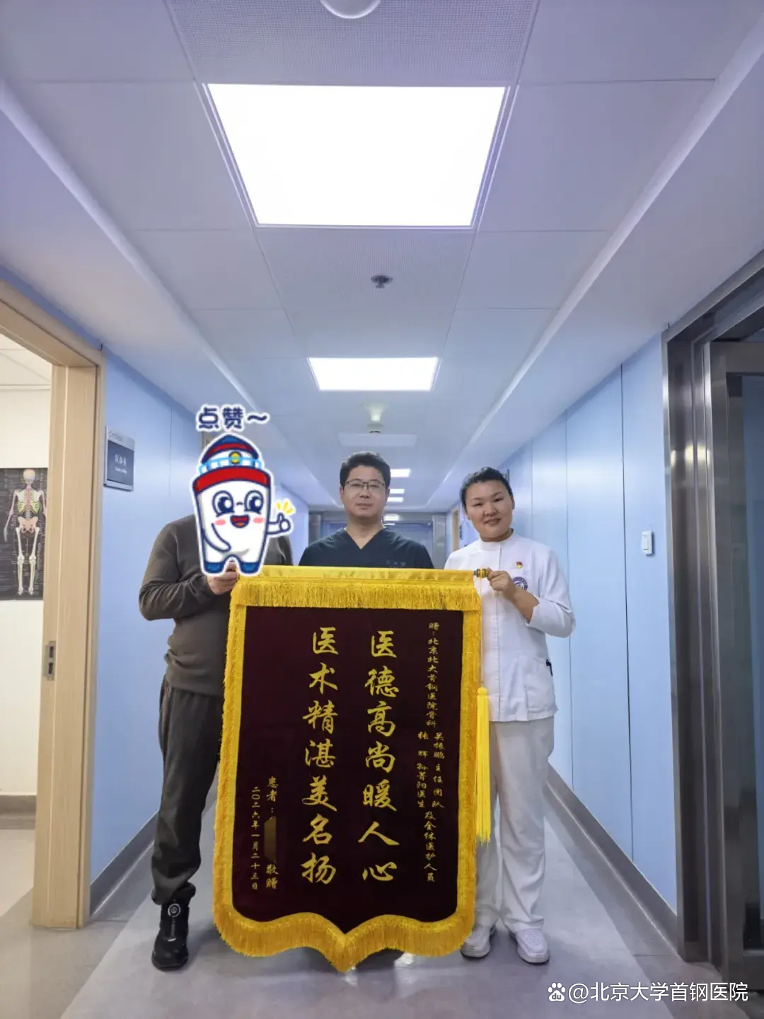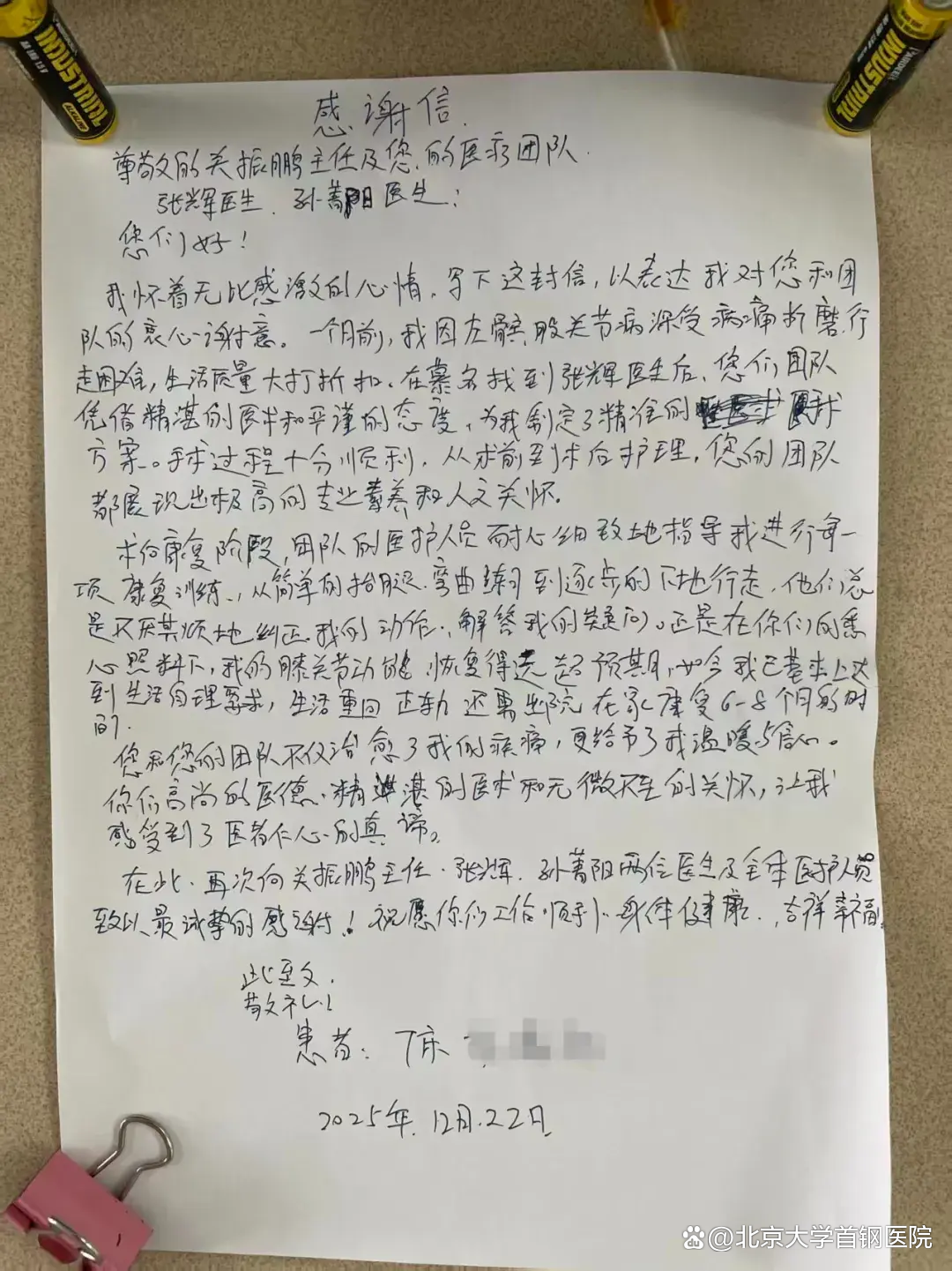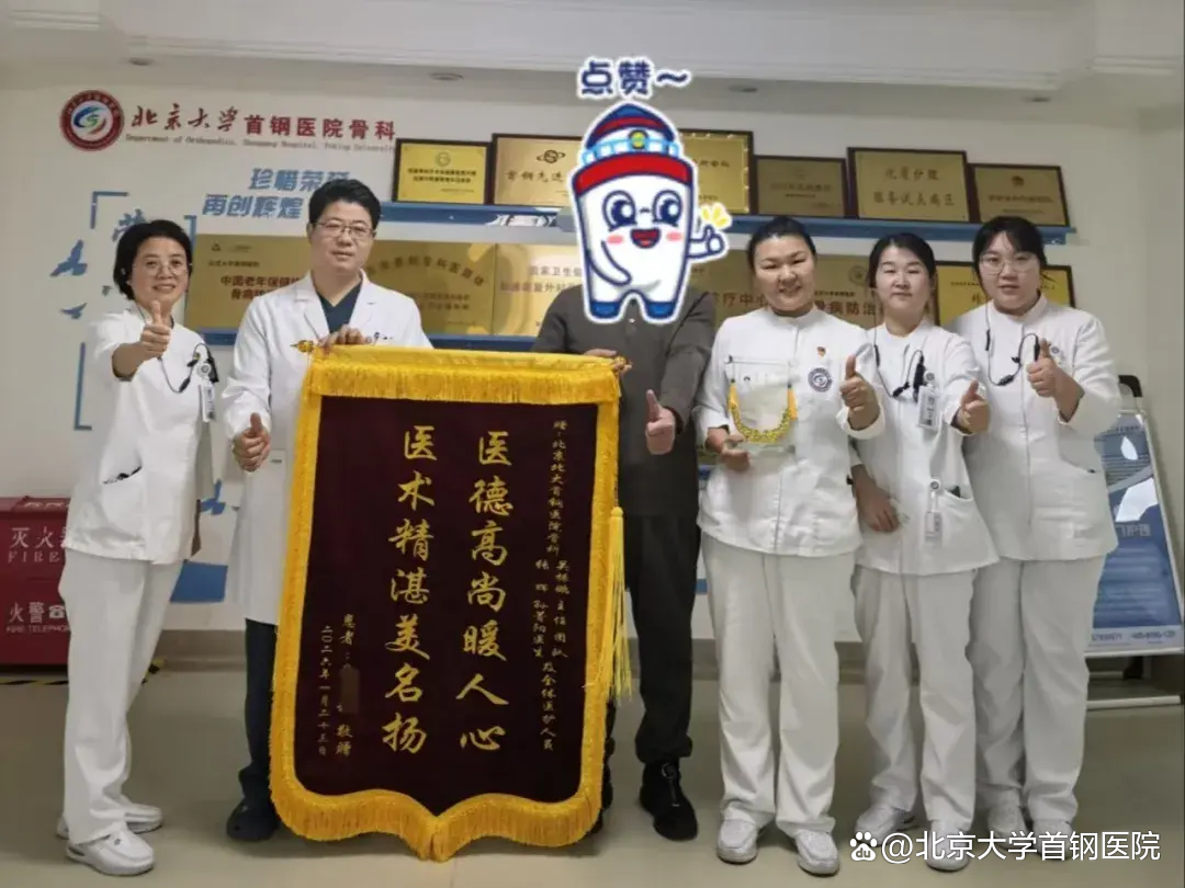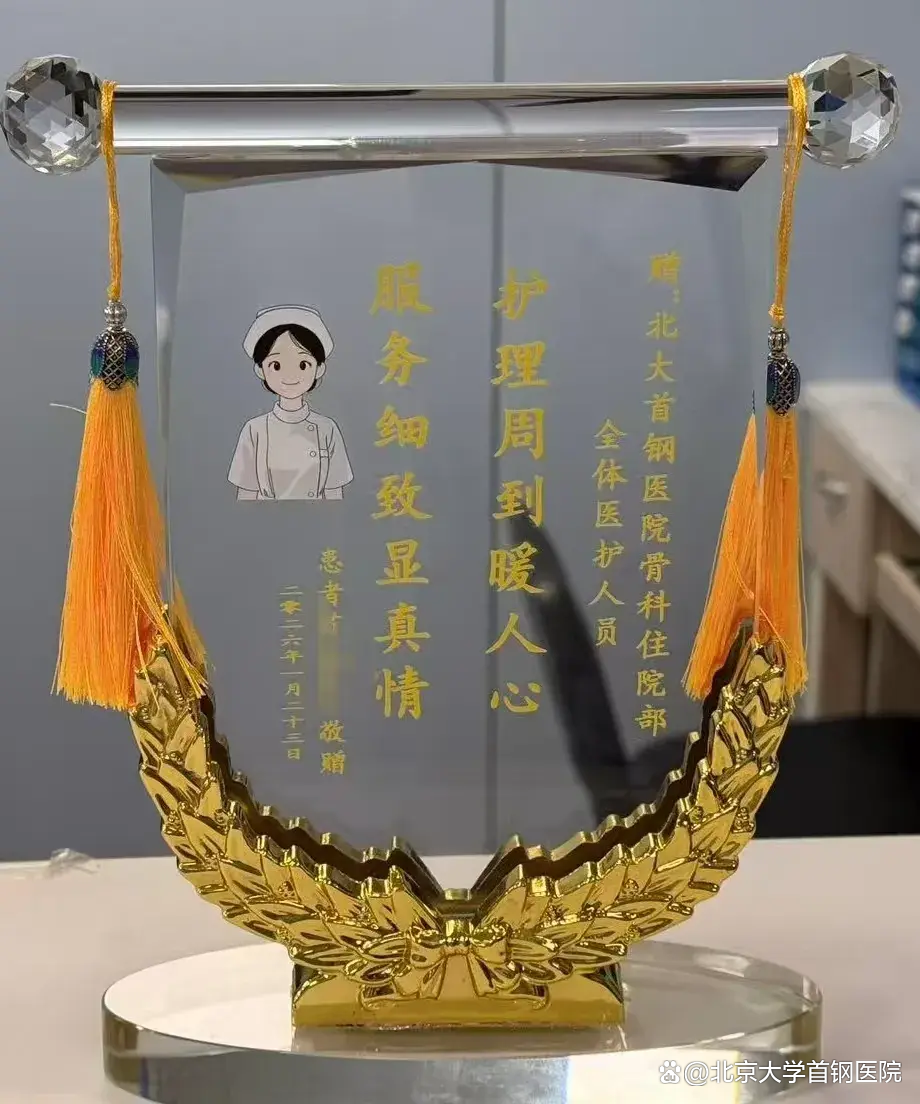 近日,北京大学首钢医院骨关节科上演了温情一幕。一位出院患者专程前来,将一面锦旗与一座奖杯,送到了骨关节科张辉主任、梁玉焕护士长及全体医护人员手中。此前在住院期间,这位患者就已写下过一封情真意切的感谢信。