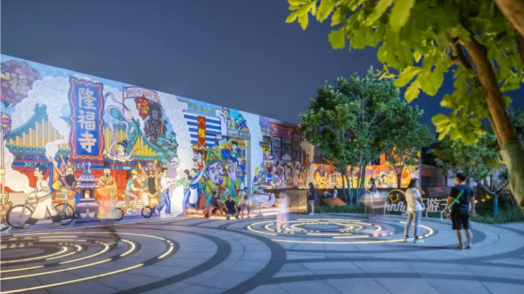 漫步其间,可见传统建筑语言被转译为当代景观设计,艺术装置自然融入街巷与花园。美术馆东侧以“O”形艺术环廊构建的开放式艺术花园,将专业艺术延伸至公共日常,形成新旧交融的视觉叙事。