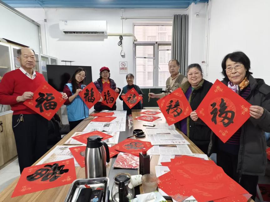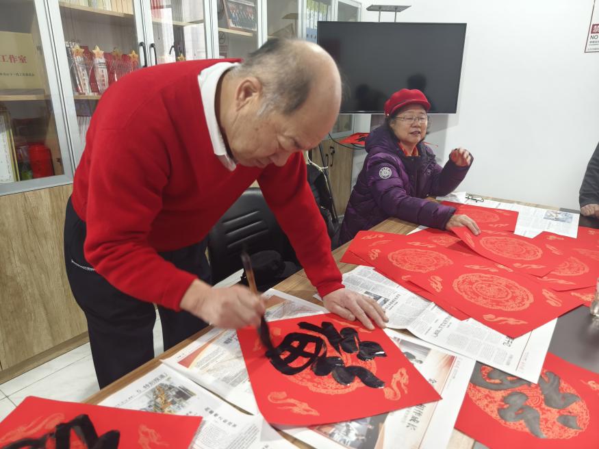 在第二现场,社区书法爱好者们泼墨挥毫,写了喜庆的福字。