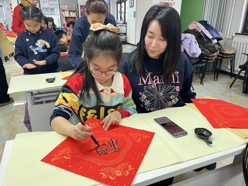 随后的亲子共写环节成为全场焦点。在老师指导下,家长与孩子们一起铺纸、握笔、挥毫,或携手同书,或分工合作。一笔一画间,传递的是亲情温暖,浸润的是文化传承。活动现场气氛温馨和谐,孩子们专注书写,家长耐心陪伴,共同完成了一张张满载祝愿的“福”字作品。