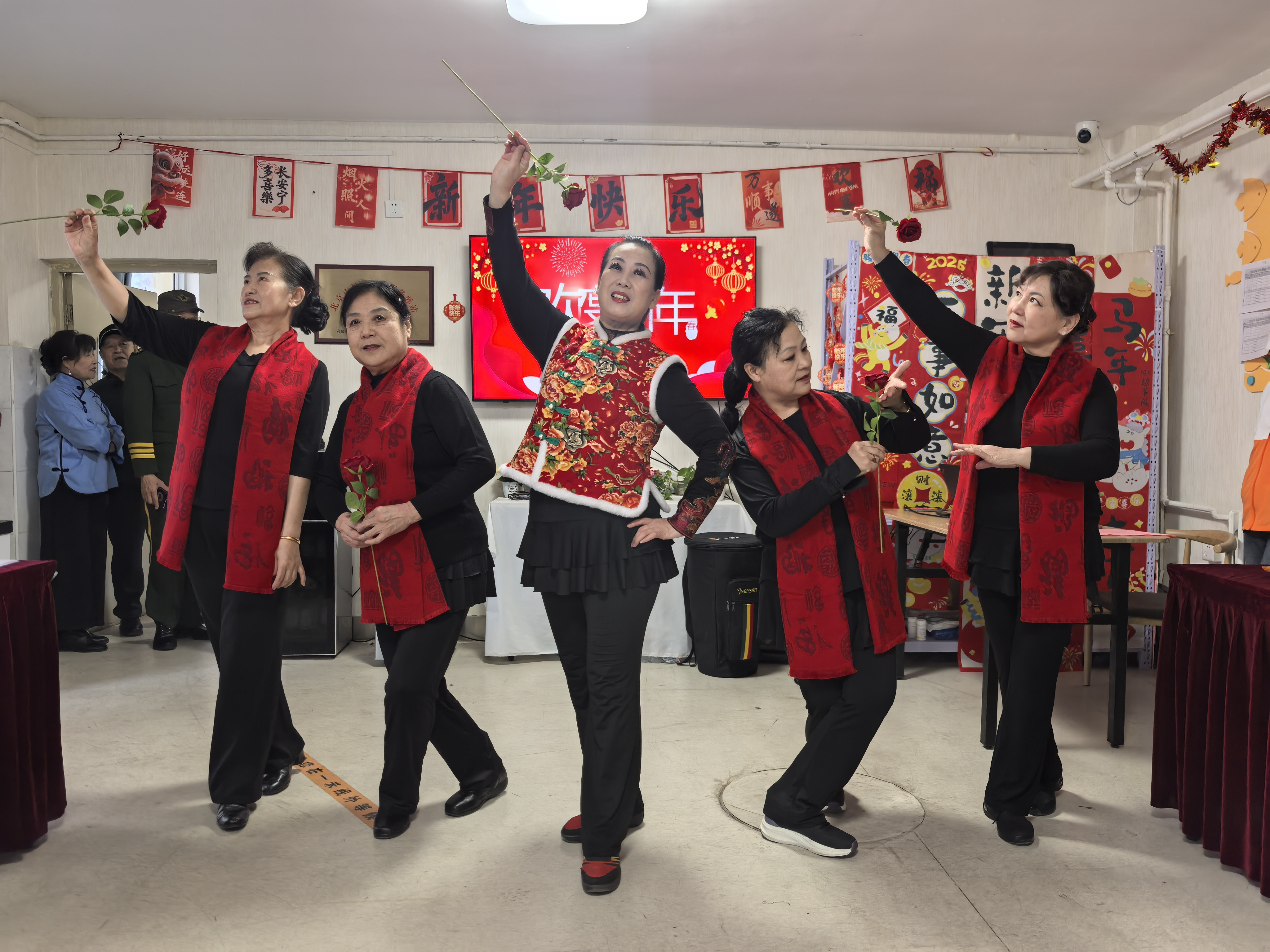 文艺表演环节精彩纷呈、暖意融融,成为茶话会的一大亮点。张文燕带来的非洲手鼓《2026马年大吉》节奏激昂、欢快有力,敲出了新春的喜庆与活力;邹晶峰的男声独唱《再见了大别山》深情婉转、韵味悠长,唤起了在场长辈们的岁月记忆;杜连云、王静英、马之菊三位阿姨演绎的豫剧《朝阳沟》选段字正腔圆、韵味十足,充分展现了传统戏曲的独特魅力。随后,舞蹈《只留清香报春来》、河北梆子《自从来了共产党》、女声独唱《江山》、走秀《花有期》等节目轮番上演,老人们各展风采、倾情演绎,现场掌声、欢呼声此起彼伏,气氛十分热烈。
