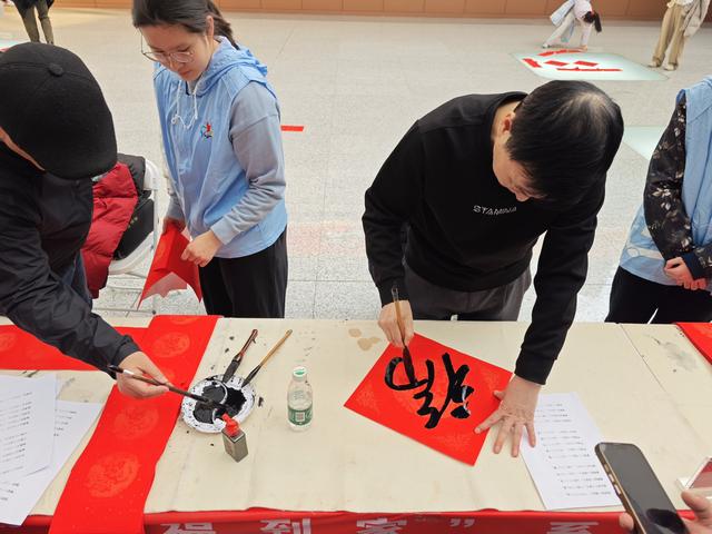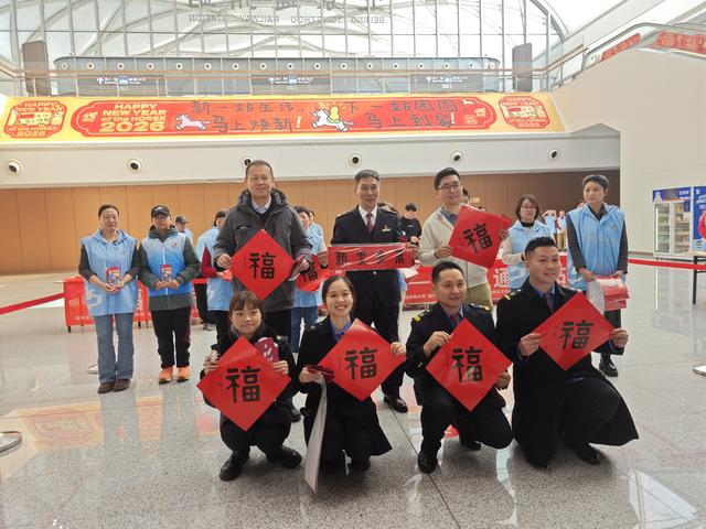 与此同时,通州站B1层东侧墨香四溢、年味浓郁,“福满京城 春贺神州”2026年北京文化志愿者“送福到家”系列文化活动暖心启幕。活动现场,北京市重点站区管委会通州站办工作人员与志愿者、书法家一道,分工协作、暖心服务,让新春的暖意传递到每一个角落。书法家挥毫泼墨,将马年生肖的美好寓意与平安顺遂的新春祝福凝于笔端,一幅幅笔力遒劲的春联、一张张吉祥喜庆的“福”字跃然纸上,免费赠予南来北往的旅客和车站一线职工。