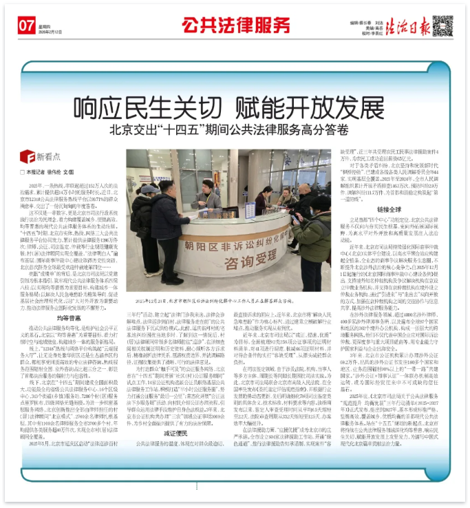 2025年底,《北京市司法局关于公共法律服务“规范提升 均衡发展”三年行动清单(2025-2027年)》正式发布,提出到2027年,基本形成标准严格、监管高效、覆盖城乡、优质均衡的首都现代公共法律服务体系。站在“十五五”规划的新起点,北京市将持续在公共法律服务领域深化均等普惠、响应民生关切、赋能开放发展上攻坚发力,为谱写中国式现代化北京篇章贡献法治力量。