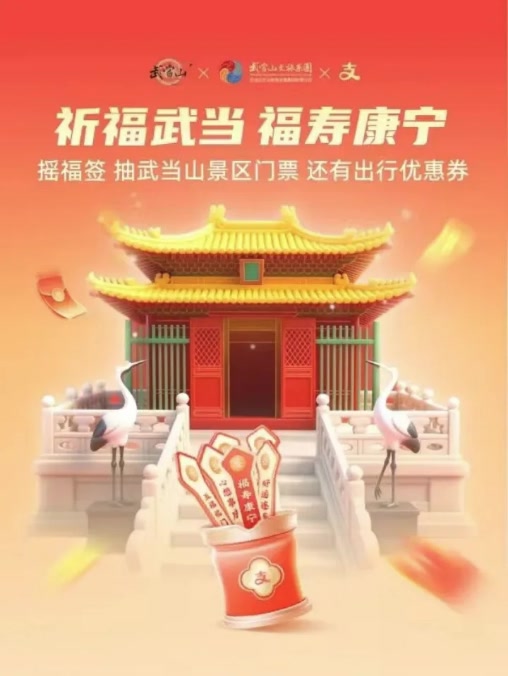 武当山金顶、南岩、紫霄宫、太子坡等核心景点,承载着和合、长寿、平安、前程等美好寓意,构成独具特色的仙山福文化体系。2026年支付宝集五福活动已全面启动并持续至除夕,武当山智慧旅游平台同步接入活动,在紫霄宫、游客服务中心、“武当一梦”园区等景点设置“福文化”打卡点,将福运景观与古建筑、自然山水相融,形成新春特色打卡画卷。游客可一边登山祈福,一边扫码集卡,在实景福气中收获数字年味与即时惊喜。