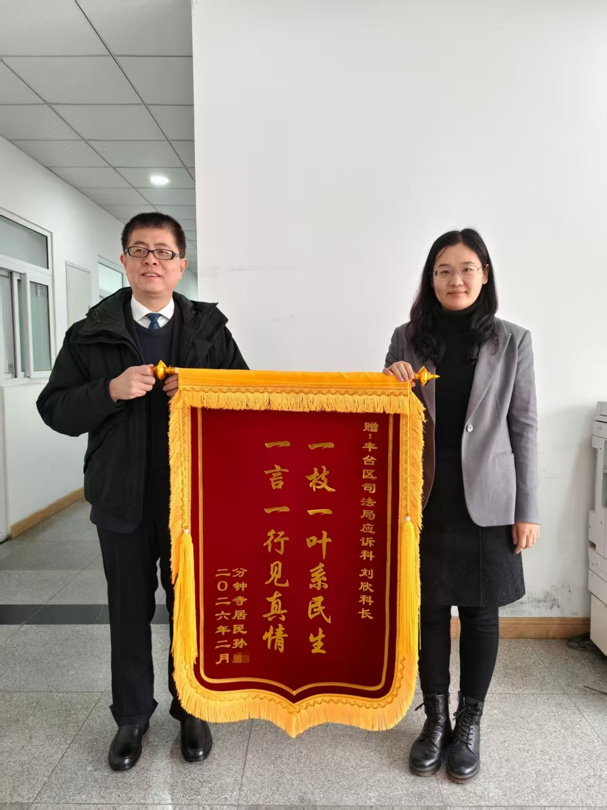 近日,分钟寺居民孙某及家属向丰台区司法局行政诉讼应诉科科长刘欣送来了一面锦旗,上面赫然写着“一枝一叶系民生,一言一行见真情”,那鲜艳的色彩与孙某眼中闪烁的泪光,已然诉说着对区司法局工作的深深谢意与高度肯定。这面锦旗,恰似冬日里的一抹暖阳,穿透寒意,温暖了每一位司法行政工作者的心田。从曾经的对簿公堂到如今的息诉罢访,再到送上锦旗,这背后究竟有着怎样动人的转变?故事还得从2025年说起。