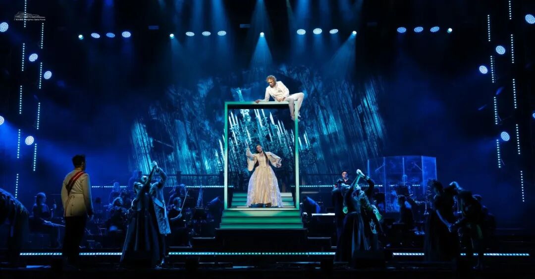 相较于2014年首次来华的全舞台制作版,《伊丽莎白》在近年巡演中多采用音乐会版本,这也是当前许多德奥音乐剧巡演的主要形式。需要指出的是,此处的“音乐会版本”并非简单的站着演唱,其核心在于舞美上的“减法”。本剧摒弃了复杂的实体布景换场,凝练为固定于舞台两侧的旋转楼梯以及中央极具标志性的大型画框装置。现场乐队分布于画框两侧的台阶上,由此将舞台自然分割为前台画框区、二层平台及两侧楼梯四个表演区域。