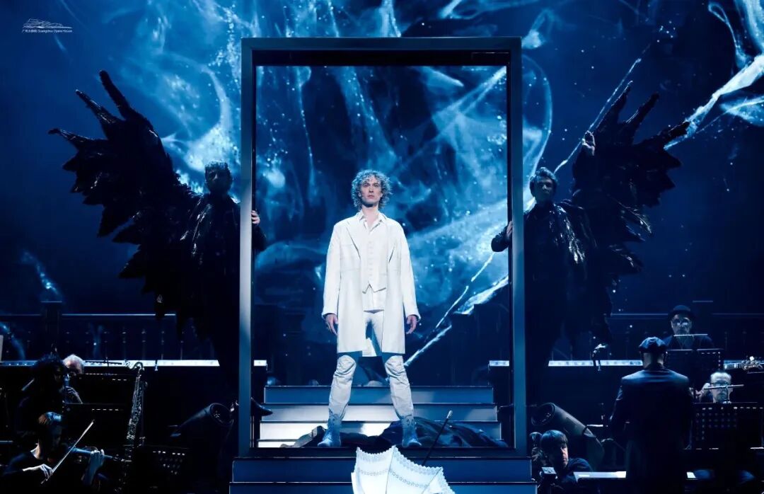 死神扮演者卢卡斯·迈尔在上轮中国巡演时作为B组登场,不稳定的演唱发挥使得观众在本次开演前抱有一丝疑虑。许是经过了一年的打磨,他成为本轮巡演中最惊艳的黑马。死神在剧中具有双重性:他既是死亡的化身,也是伊丽莎白灵魂自由的引渡者,是魔鬼也是天使。与前任扮演者不同,卢卡斯的嗓音呈现出非常“不科学”的两极化特质,兼具天鹅绒般的柔滑与锐利的金属质感。在同一唱段中,他能在轻柔浪漫抚慰人心之后瞬间拉满爆发至摇滚状态。在“最后一舞”(Der Letzte Tanz)、“阴霾渐袭”(Die Schatten werden länger)等唱段中,他最擅长的、被剧迷称为“拉花”的长音炫技和变调转音,为死神注入了邪魅而神性的点睛之笔。天使的面容、蛊惑的声线、白色的西装、黑色的翅膀,多重矛盾元素的叠加,使得伊丽莎白视角下“死即是生”的哲学命题更易为人所理解。