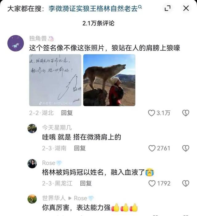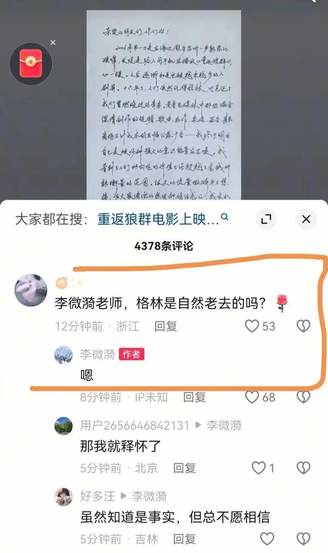 李微漪在信中说,每当过年,人们就会倍加思念远方的亲人。16年了,没有永恒的生命,尽管那是我们的美好愿景。草原人有一个传统,当亲人离去后,留下的人不会重新再去谈论关于他的种种。所以,狼妈妈再没什么可说的了,儿子一切的故事都封存在了那些年的文字和光影里。评论区,有网友询问“格林是自然老去的吗?”她回复“嗯”。