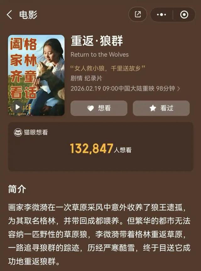 近日,纪录片《重返狼群》再度爆火,大年初三将在院线重映。极目新闻记者采访获悉,原著也将于今年3月再版。成都画家、作家李微漪和狼王格林的故事感动了无数网友,她在信中说:“十六年了,人们依然记得格林,泼天的流量并不想接,但大家滂沱的热泪却倾注我心,我会永远珍藏,这才是人间值得!”