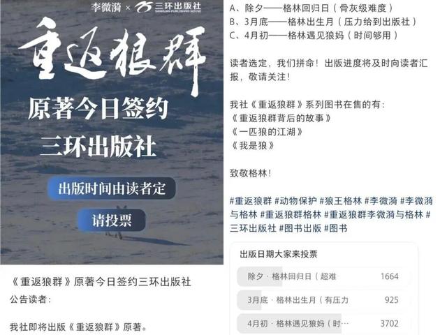 1月23日,三环出版社公告读者,《重返狼群》原著今日签约,邀请广大读者投票决定出版时间,并给出格林回归日除夕(骨灰级难度)、格林出生月的3月底(压力给到出版社)和格林遇见狼妈的4月初(时间够用)三个选项。