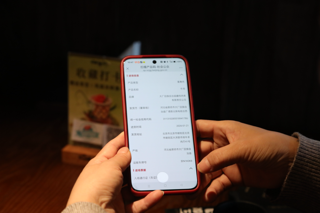 “扫码就能看到这盘牛肉的品牌、产地、检疫报告、进货时间等信息。”在中关村ART PARK大融城的“山夏间”餐厅,市民王女士点完一道鲜切牛肉,按照服务员的指引扫描菜单上的“追溯码”,手机屏幕立刻显示出这道菜品所用牛肉的完整“身份档案”。