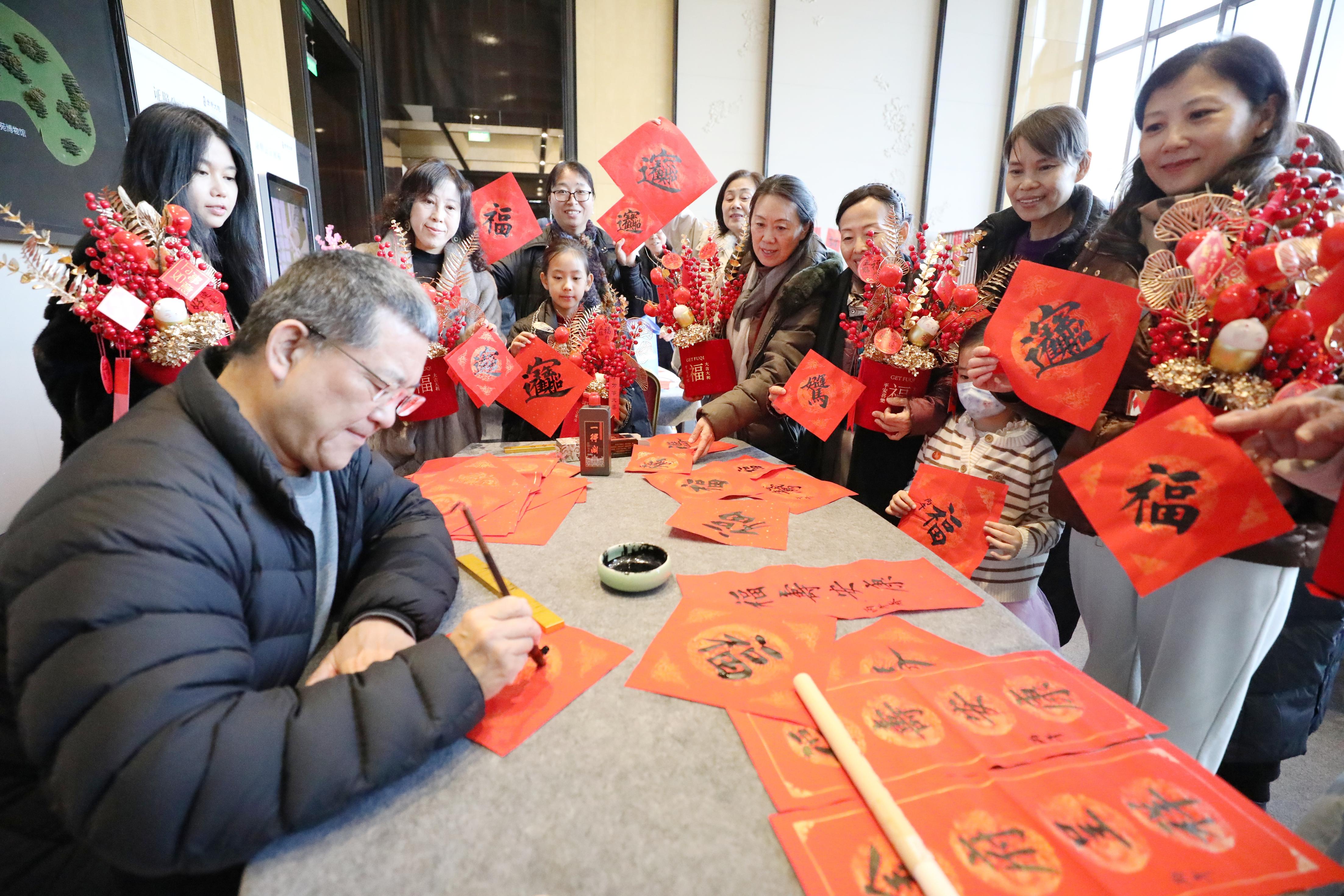 在众多社区活动现场,最具人气的当数“笔墨迎春”环节。社区书法能人铺纸研墨,将美好的新春祝福凝于笔端,现场书写的“福”字与春联被赠予居民,传递着纸短情长的邻里情谊。非遗手工体验区同样热闹非凡,编结、拓印、织锦相框、宋锦挂饰等传统技艺在居民手中“活”了起来,尤其是青少年在亲手制作中,深刻感受到非遗的温度与魅力。