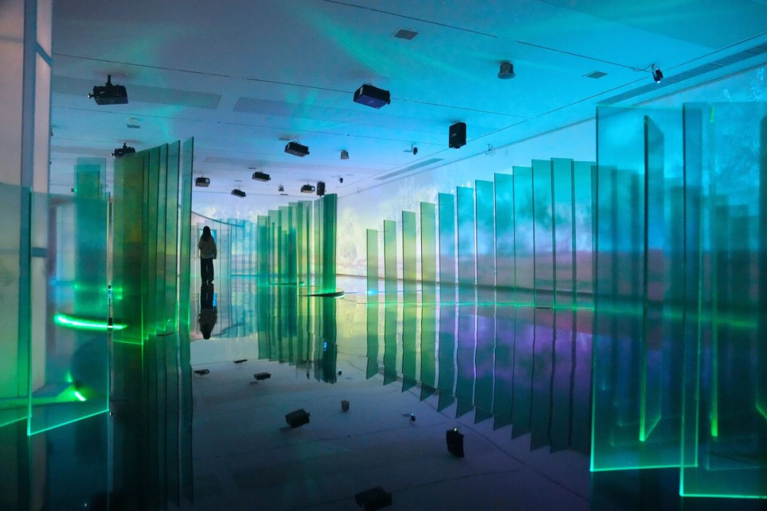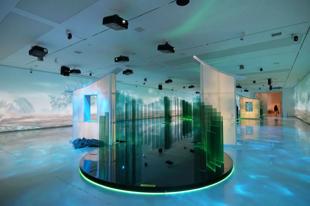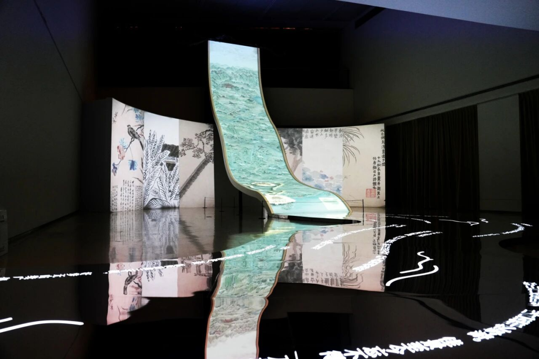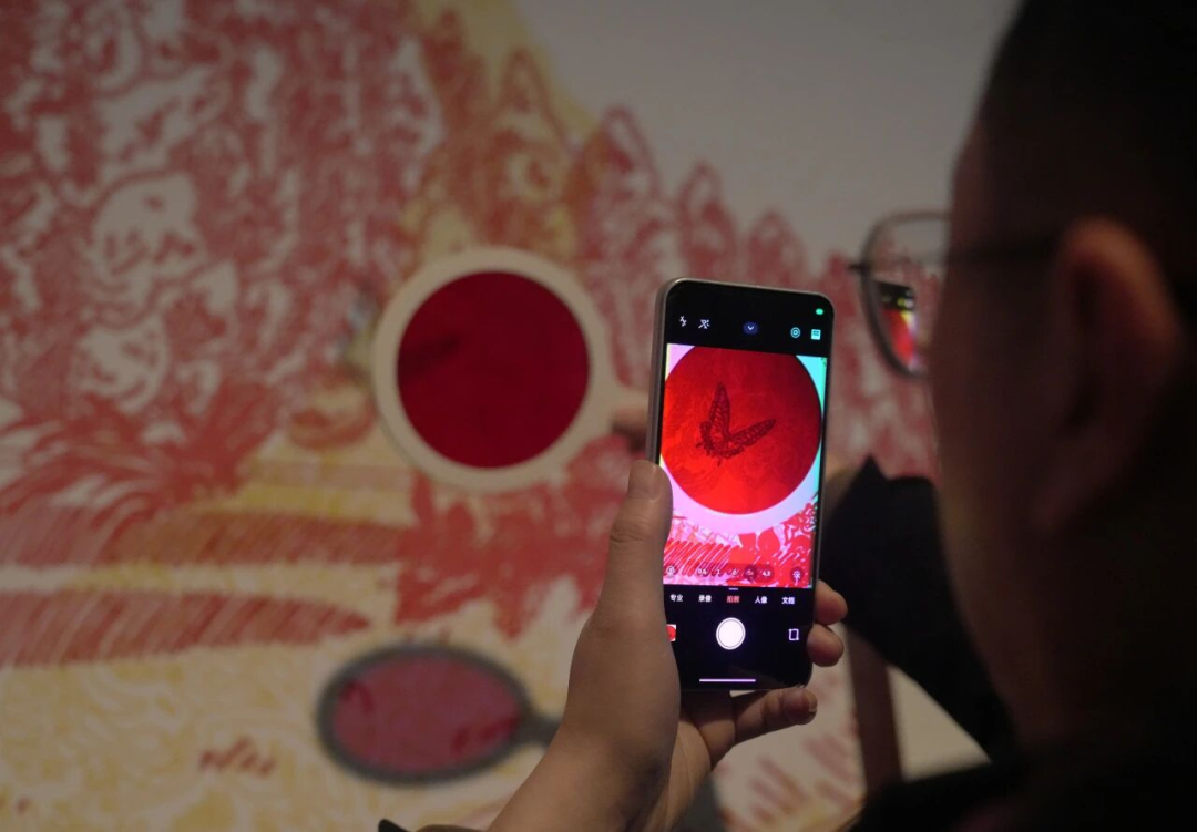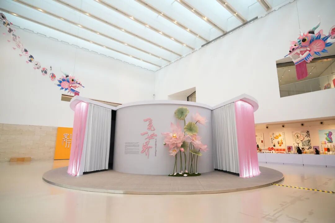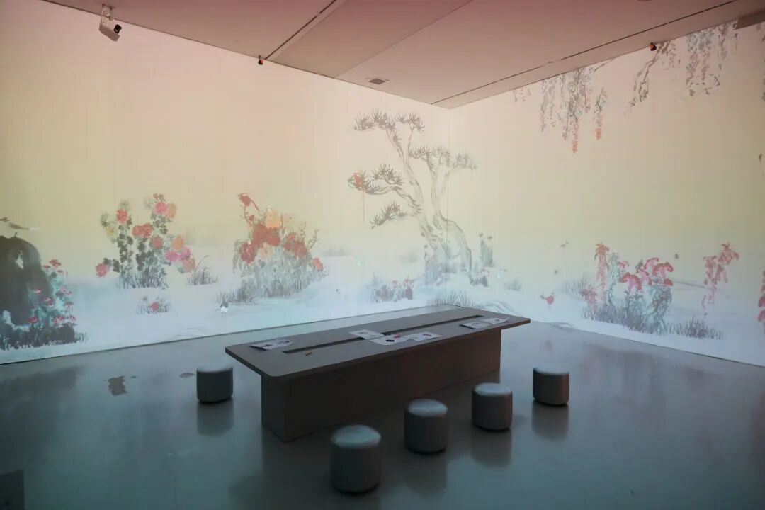 步入山东美术馆二楼,开幕式大厅的“一花一世界”装置便映入眼帘,齐白石的经典画作通过动态光影在装置内部呈现,色彩与线条交织,带来极具冲击力的视觉体验。