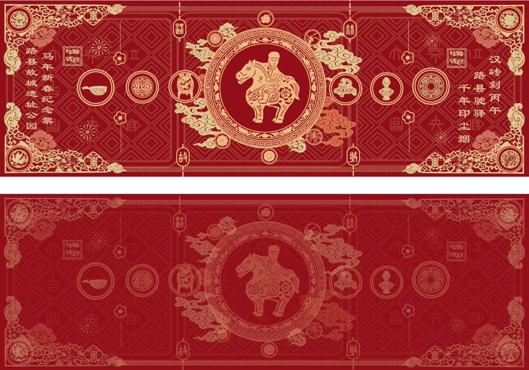 新春将至,为迎丙午马年,路县故城遗址公园特别推出“文物跃新岁”系列纪念票。纪念票选取馆藏文物元素,融合传统年味与艺术设计,绘就骏马迎春、祥云绕瑞的吉祥图景,寓意新的一年奔腾奋进、福运绵长。