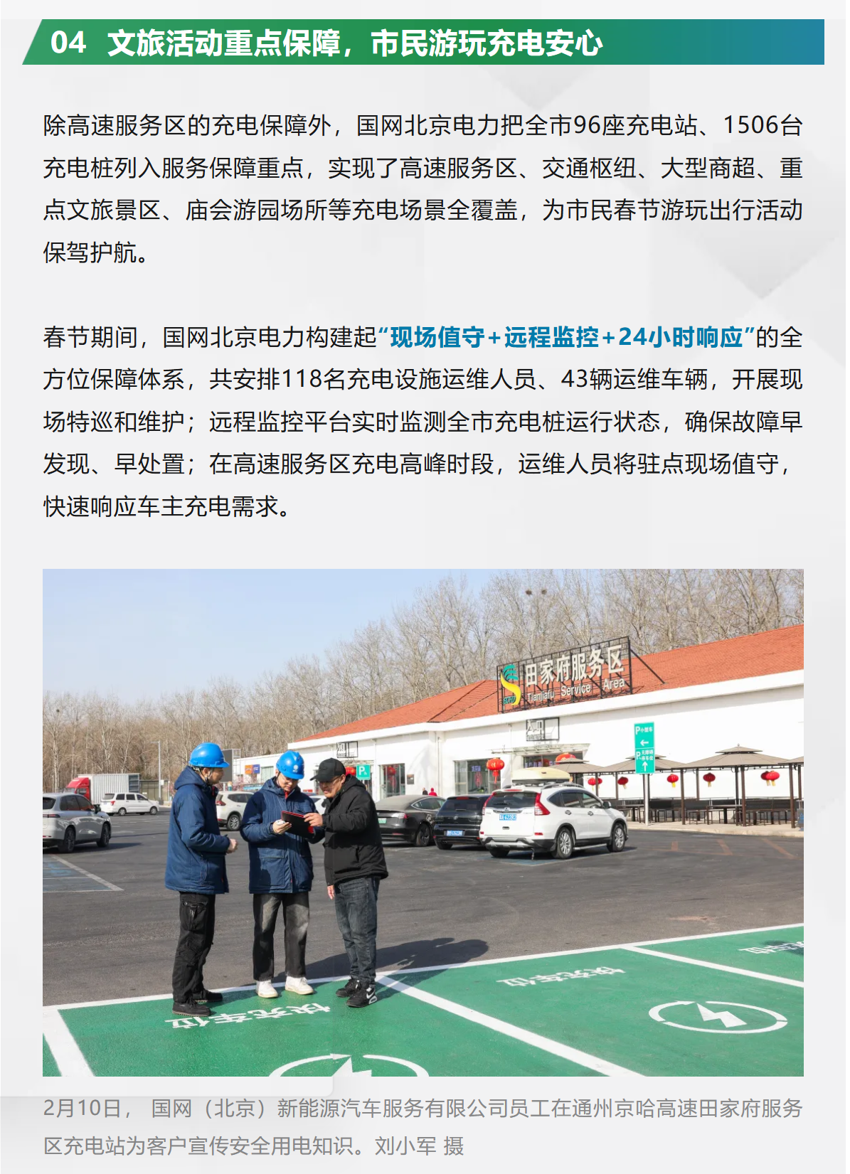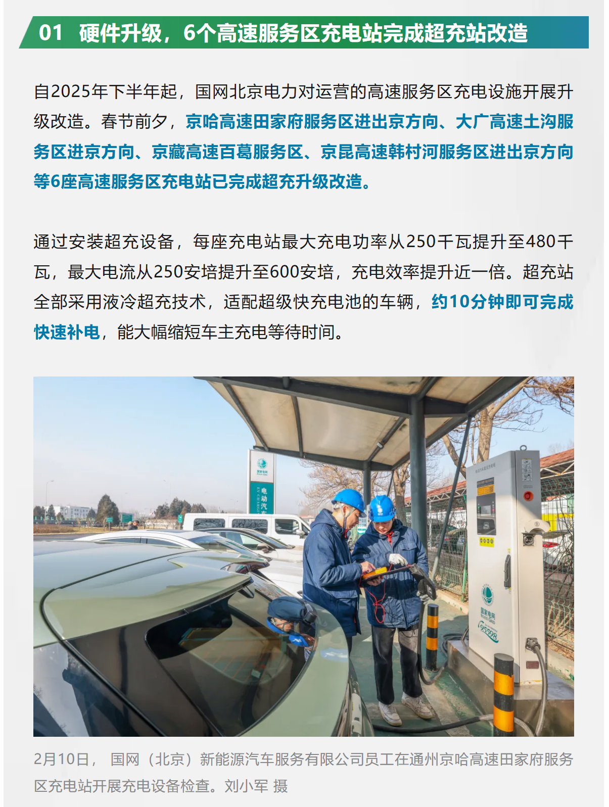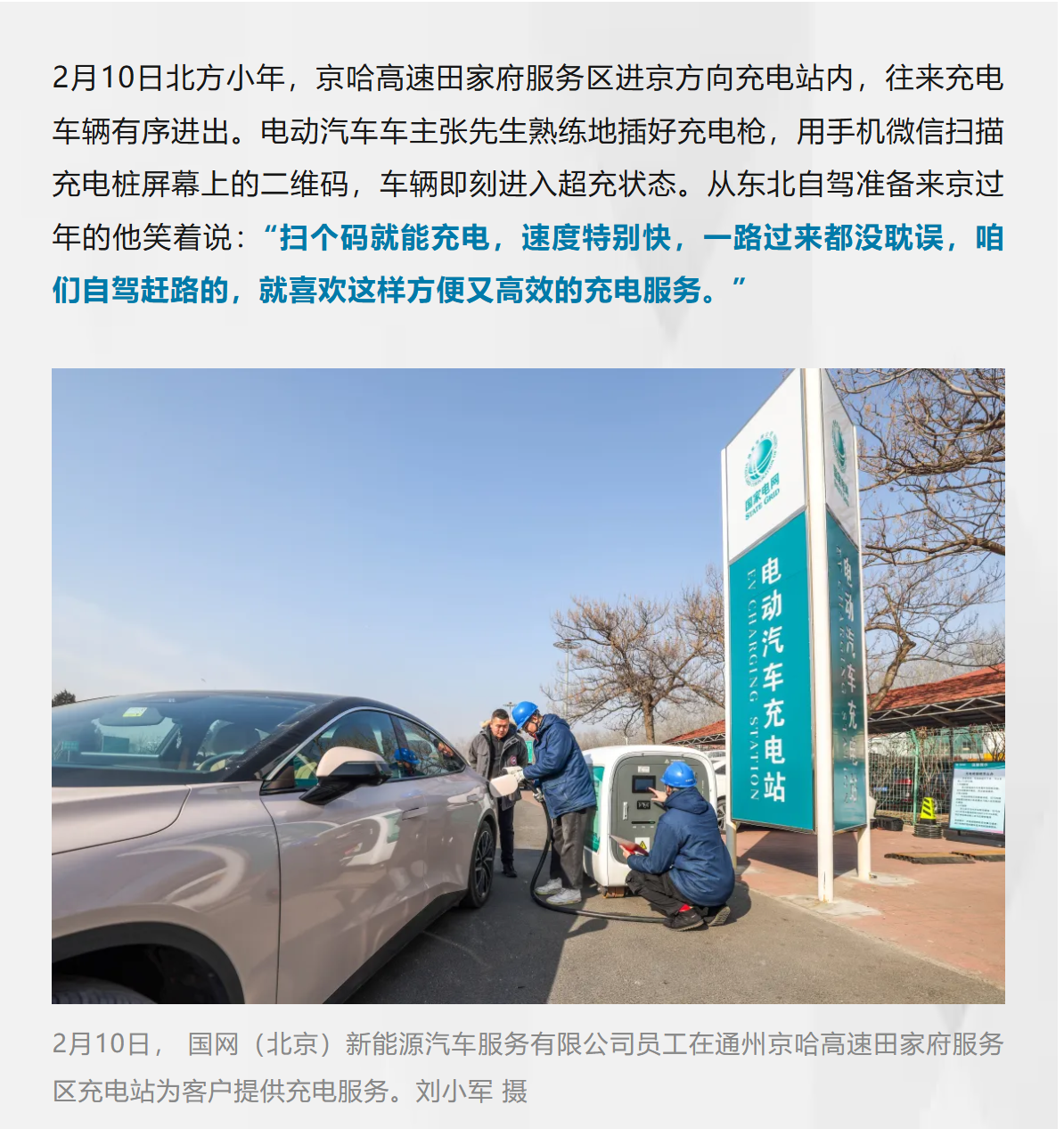 从高速服务区升级的超充站,到市区密集的充电网络;从扫码即充的便捷服务,到在岗值守的运维人员,国网北京电力以硬核的设施保障、暖心的现场服务,为春节期间市民游客的绿色出行保驾护航。(来源:国网北京市电力公司)