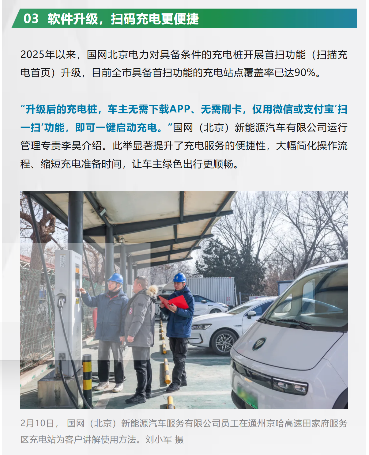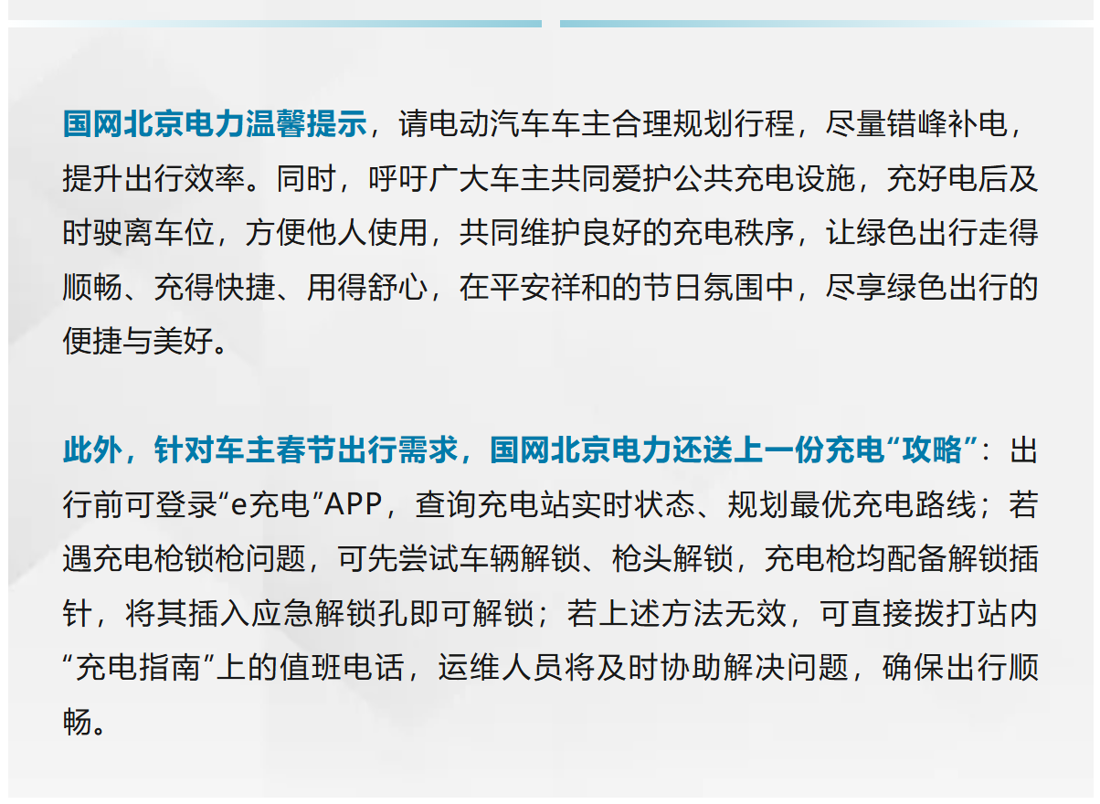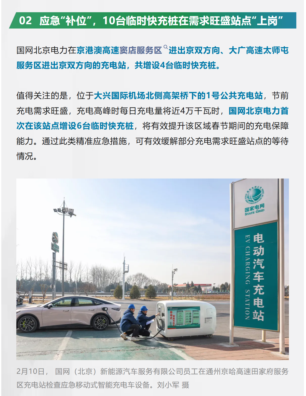 从高速服务区升级的超充站,到市区密集的充电网络;从扫码即充的便捷服务,到在岗值守的运维人员,国网北京电力以硬核的设施保障、暖心的现场服务,为春节期间市民游客的绿色出行保驾护航。(来源:国网北京市电力公司)