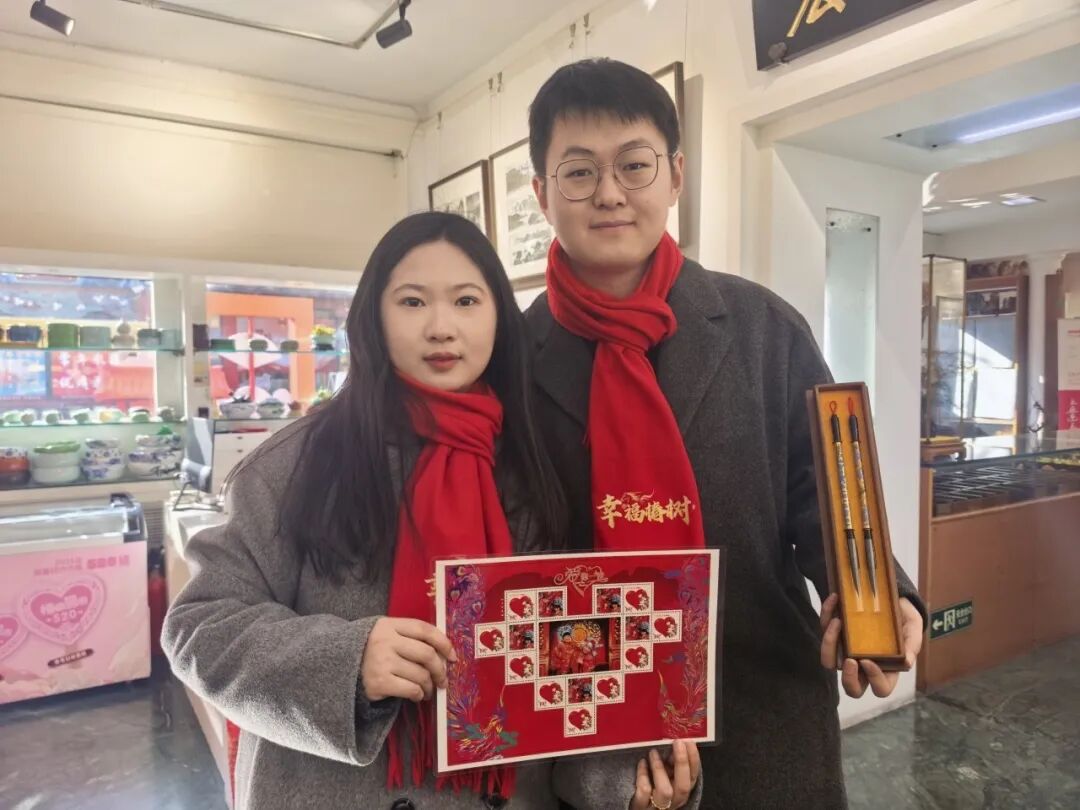 “这份结婚五件套,藏着最厚重的中式浪漫与祝福。”在宏宝堂门店内,工作人员正向一对金婚伉俪介绍椿树街道打造的结婚五件套。结婚五件套作为融合了非遗技艺与婚恋美好寓意的文创产品,涵盖荣宝斋木版水印荷花、戴月轩夫妻结发笔、宏宝堂传统婚书和囍印章、一得阁爱情永恒印泥和中国邮政爱情专题个性化邮票,每一件都承载着老字号的匠心,镌刻着“执手偕老、岁岁相依”的美好期许。听了工作人员讲解,他们当即决定买单:“这份结婚五件套既有漂亮,又有老传统的味道,看到老字号也在跟着时代去创新,我们也感到很惊喜。”