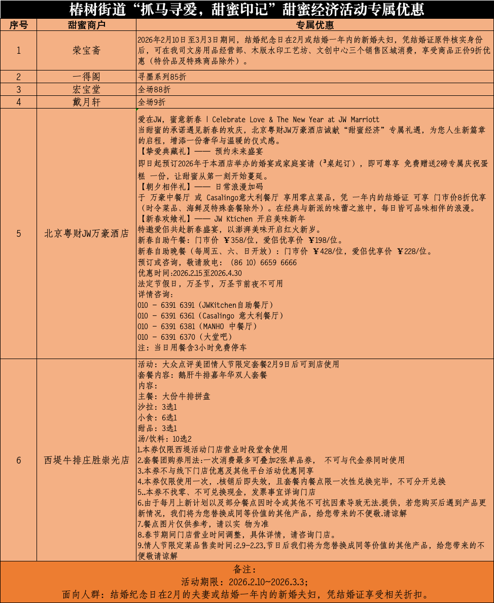 本次活动从2月10日小年持续至3月3日元宵节,期间琉璃厂东西街老字号以及万豪酒店等甜蜜商户的联动放“价”,以“产品上新+专属优惠”双轮驱动,点燃“甜蜜经济”。活动期间,结婚纪念月在2月的夫妻和领证不超过一年的新婚夫妇,均可凭结婚证在一得阁、宏宝堂、戴月轩、荣宝斋享受专属优惠。