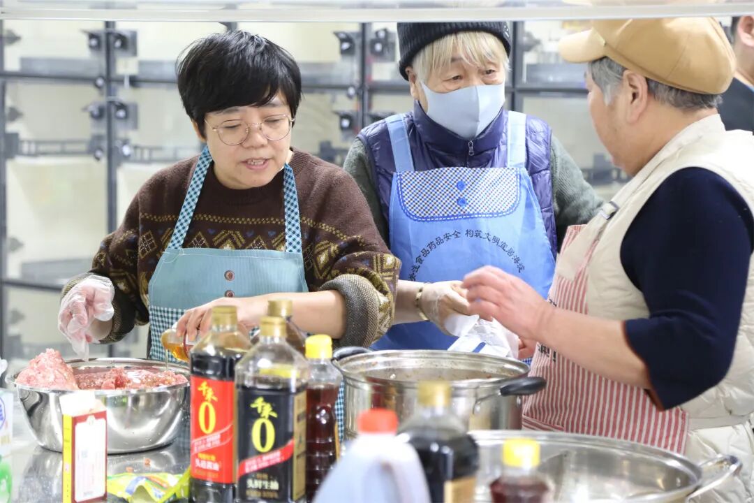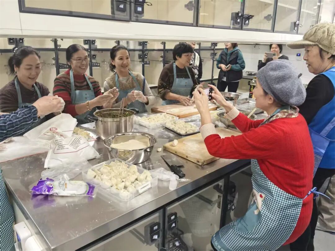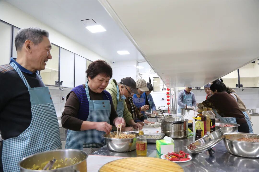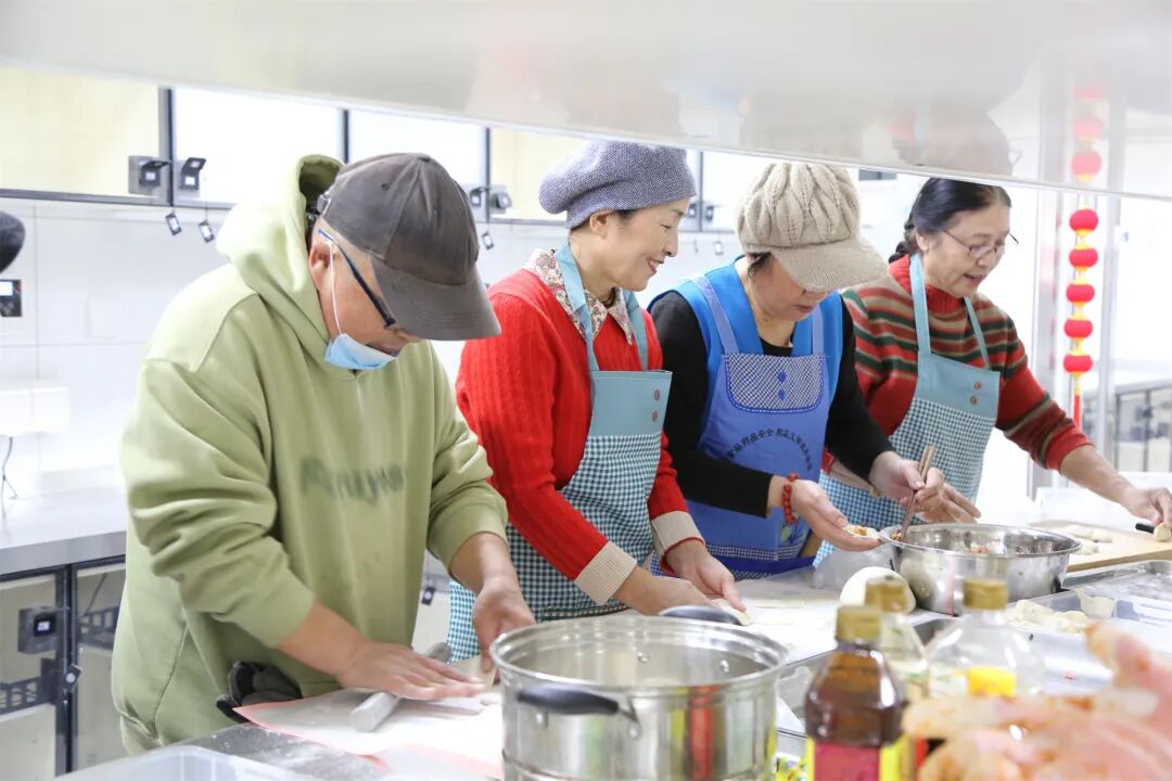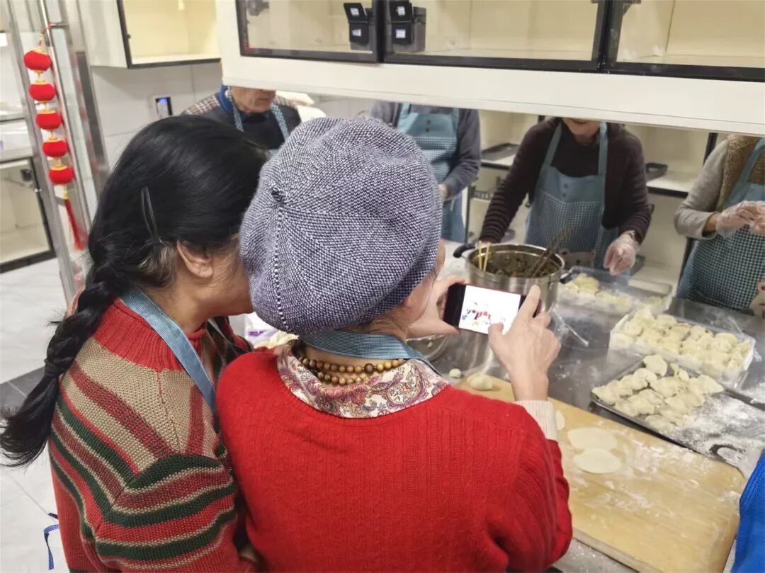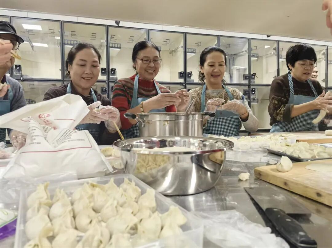 面香、馅香、灶火气,裹着浓浓的年味儿从窗口飘散出来。十几位居民围在长长的操作台前,揉面、擀皮、包馅,手里的活儿不停,嘴上的家常也拉得热闹。几位挨在一起包饺子的老邻居,还互相招呼身旁的老姐妹:“快给咱们拍一张,这新厨房头一回开伙,咱们得留个念!”