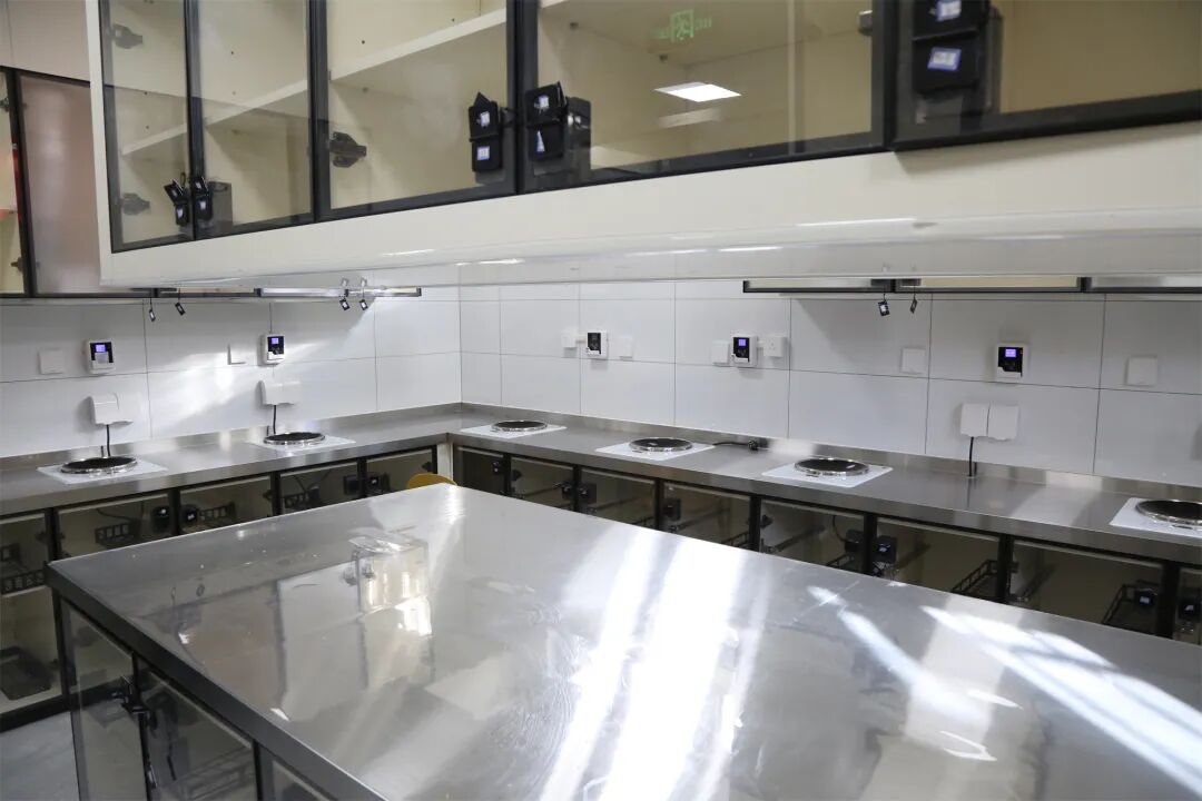记者看到,一百多平方米的空间内,几排崭新的操作台上,灶具整齐划一。操作台上方是一排排带着玻璃门的小柜子。柜里装着调料架,酱油醋瓶摆得规规矩矩;柜子顶部专门焊了一个不锈钢挂架,一只锅盖正正好好地架在上面。墙角立着智能烤箱,窗边还有扫地机器人。