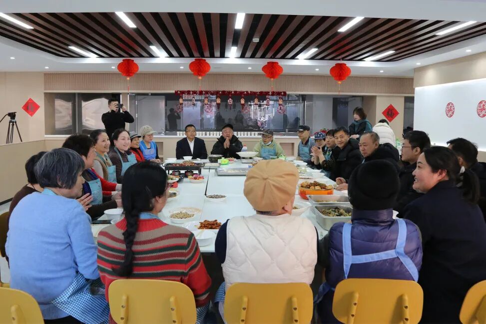 说话间,第一锅饺子热腾腾地出了锅。几位大妈端着刚包好的饺子,径直穿过东侧那扇玻璃门,走进了正在筹建中的“海淀食堂”。门一推开,食堂里几十张座椅整齐排列,几张长桌已被居民们自发拼成临时大餐桌,辖区周边餐饮企业也为这场社区家宴送上了自家拿手菜,为共享厨房添上浓浓烟火气,红烧带鱼、四喜丸子、凉拌木耳……一盘盘家常菜陆续摆上桌,静候着饺子入席。