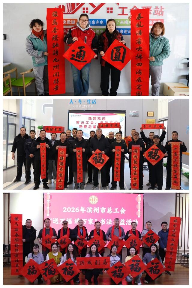 滨州日报/滨州网讯为弘扬中华优秀传统文化,营造欢乐祥和的节日氛围,2月9日-11日,滨州市总工会先后走进企业、机关、工会驿站开展2026年“送万福 进万家”书法公益活动。