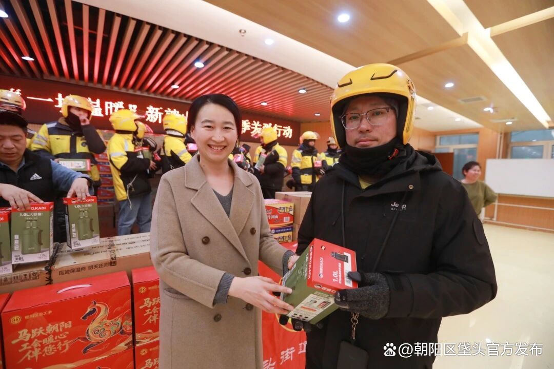 随后,盖春燕同志一行将护膝、保温水壶、方便食品、节日礼盒等实用物资送到外卖员手中,叮嘱大家在忙碌工作的同时注意防寒保暖、劳逸结合,并向他们送上新春祝福。