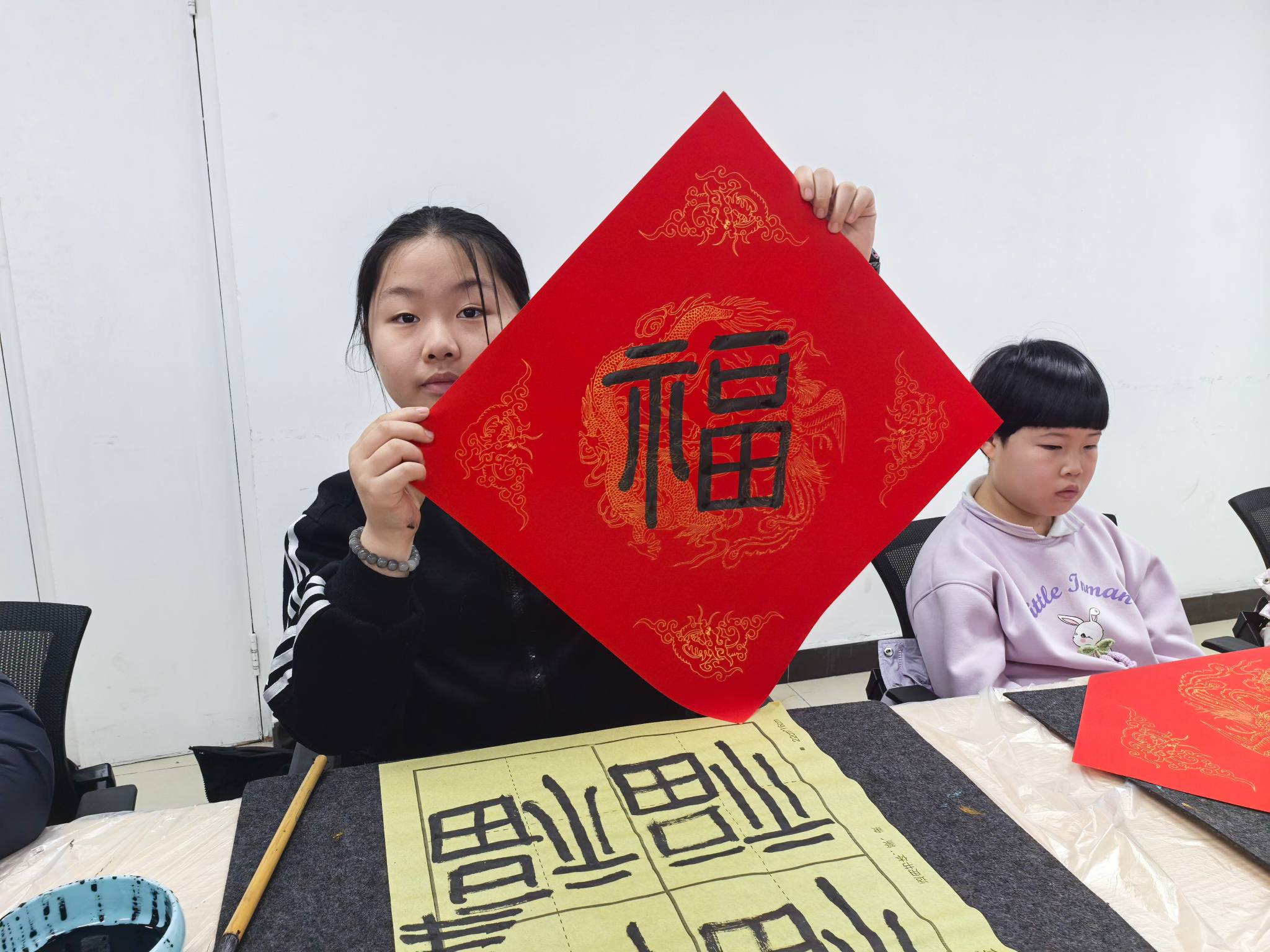 在老师的悉心指导下,孩子们纷纷提笔蘸墨、大胆创作。有的凝神静气,一笔一划书写福字,笔触虽显稚嫩却饱含真诚;有的相互交流、彼此鼓励,分享书写的乐趣与心得,你帮我扶纸,我为你点赞,小小的活动现场,处处涌动着互助友爱的暖流。