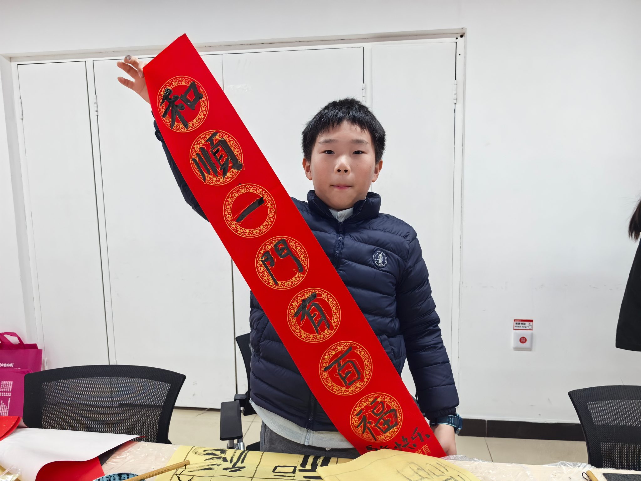 墨香袅袅,暖意阵阵。不一会儿,一幅幅形态各异的福字、一副副寓意吉祥的春联跃然纸上,或端庄工整、或灵动洒脱,每一笔都承载着孩子们对新春的美好祝愿,每一个字都寄托着对家人的真挚祝福。孩子们捧着自己亲手书写的作品,脸上洋溢着自豪与喜悦,主动向老师、向小伙伴展示,也乐于将自己的“佳作”分享给身边的人,友好的氛围在笔墨间传递,暖阳的温度在互动中升温。