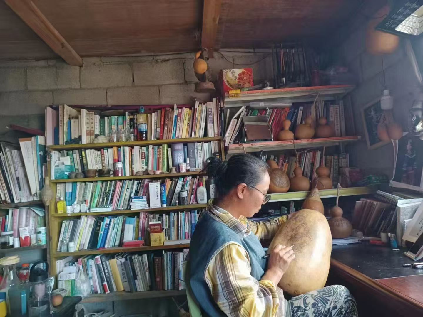 方彬喜欢葫芦,下雨天无法下地,她就在家刻葫芦;去年她生日的时候,送给自己的礼物是给自己刻个葫芦。