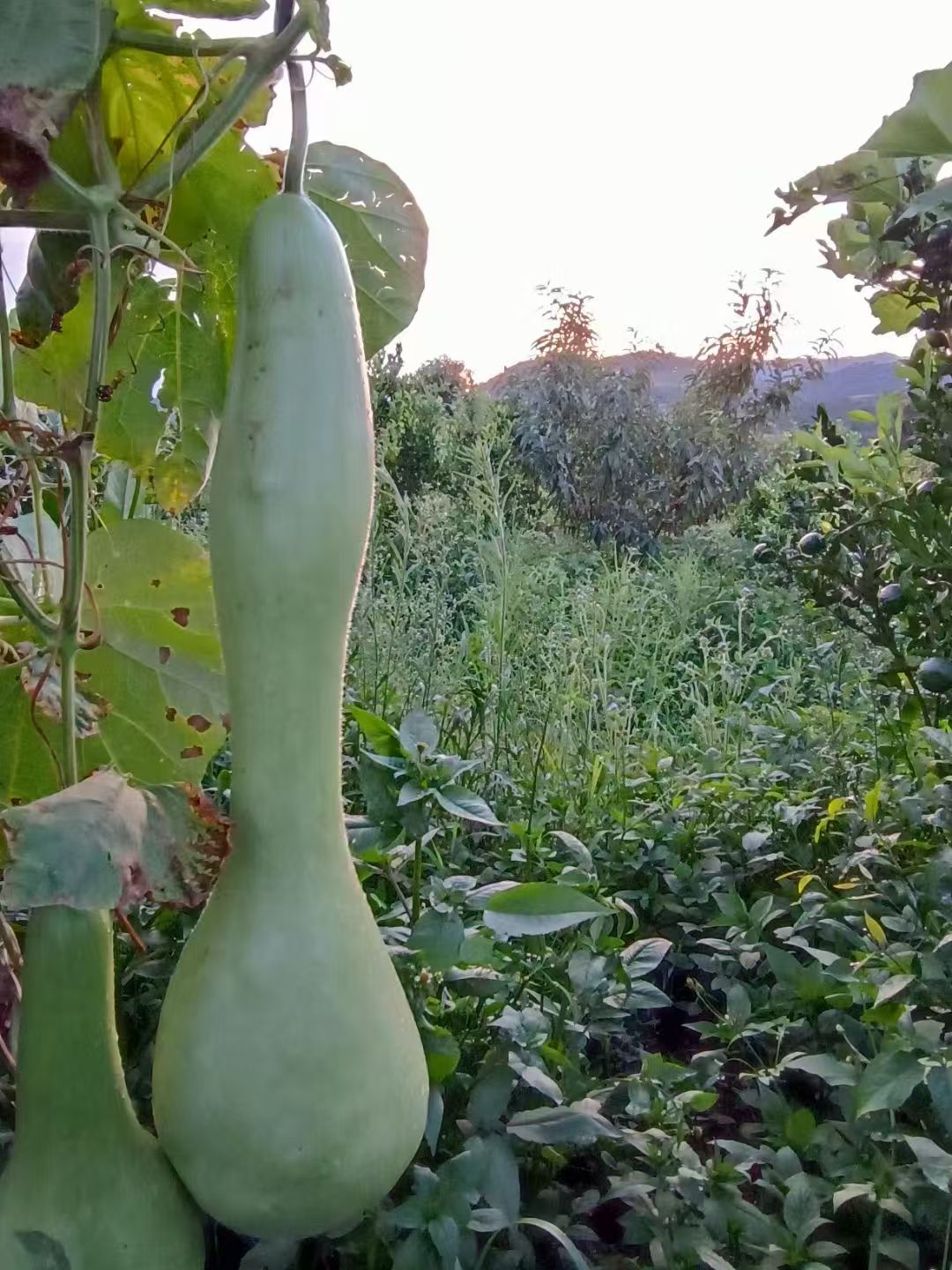 方彬种葫芦没有什么特殊的安排,大山里,撒了种子就长出来了,不搭架子也行,满地、满树地爬,纯自然生长状态,不像一些地区那样进行大田或大棚管理。