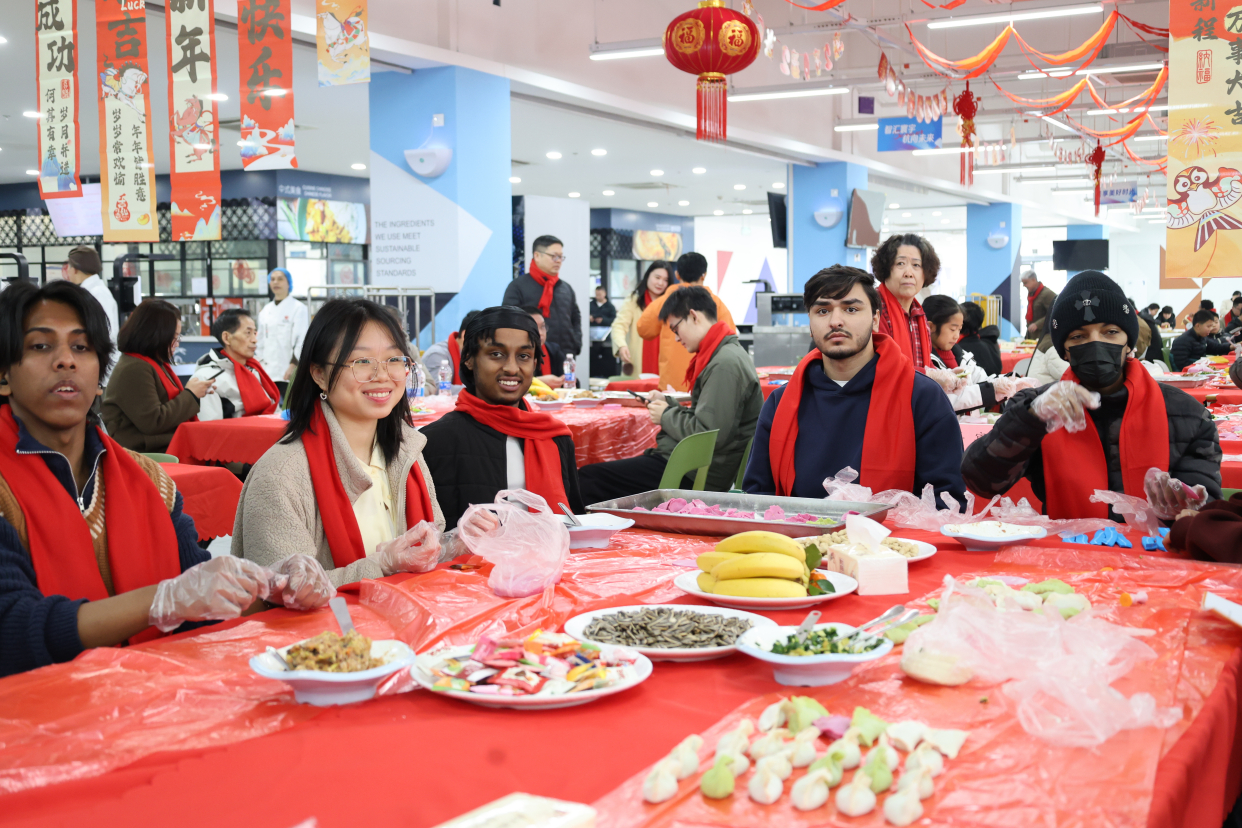 杭州国际校园同样年味满满,新春团圆宴在北区食堂温馨开席,师生欢聚一堂,共庆新春佳节,有人捏出月牙般的饺褶,有人蘸墨写下新岁第一笔,饺子捏拢天南地北的团圆,提笔描福四海心意皆相通。