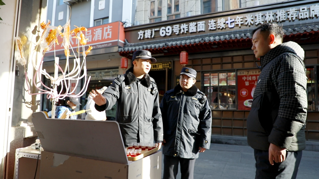 新春佳节是大栅栏商户们的经营旺季,琳琅满目的年货、特色的京味小吃吸引着八方游客,却也让城市市容和经营秩序保障迎来了关键期。为了让街区既热闹又有序,石润其和队员们从春节前就开始忙碌,节前逐户走访辖区商户,一遍遍叮嘱商户遵守经营规范。“您好,新春快乐,门口摆的年货麻烦收进店里”“这里属于禁摆区域,辛苦您挪到旁边的指定经营区,谢谢您的配合”,这样的暖心提醒,石润其每天要重复数十遍。