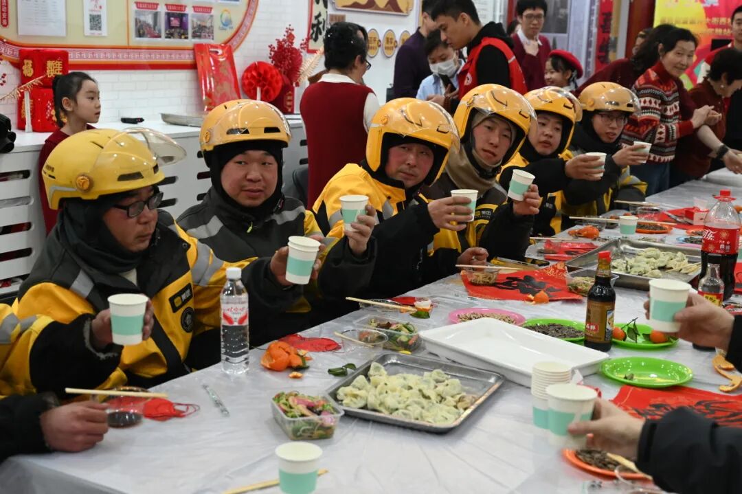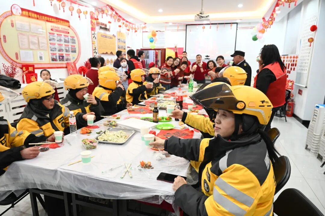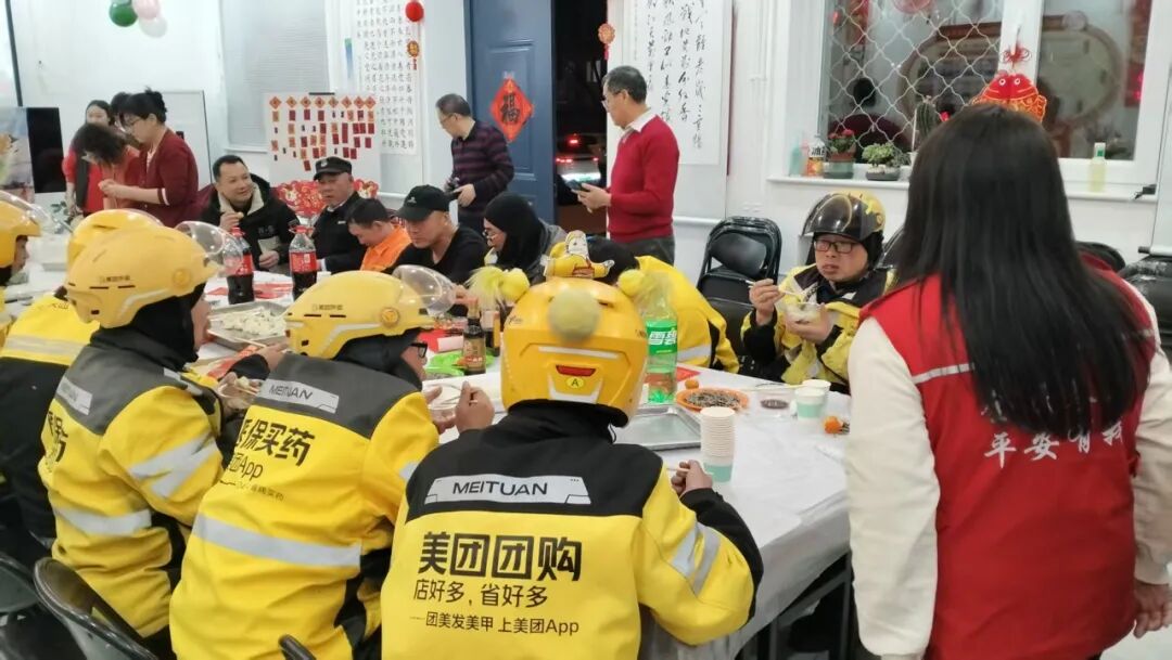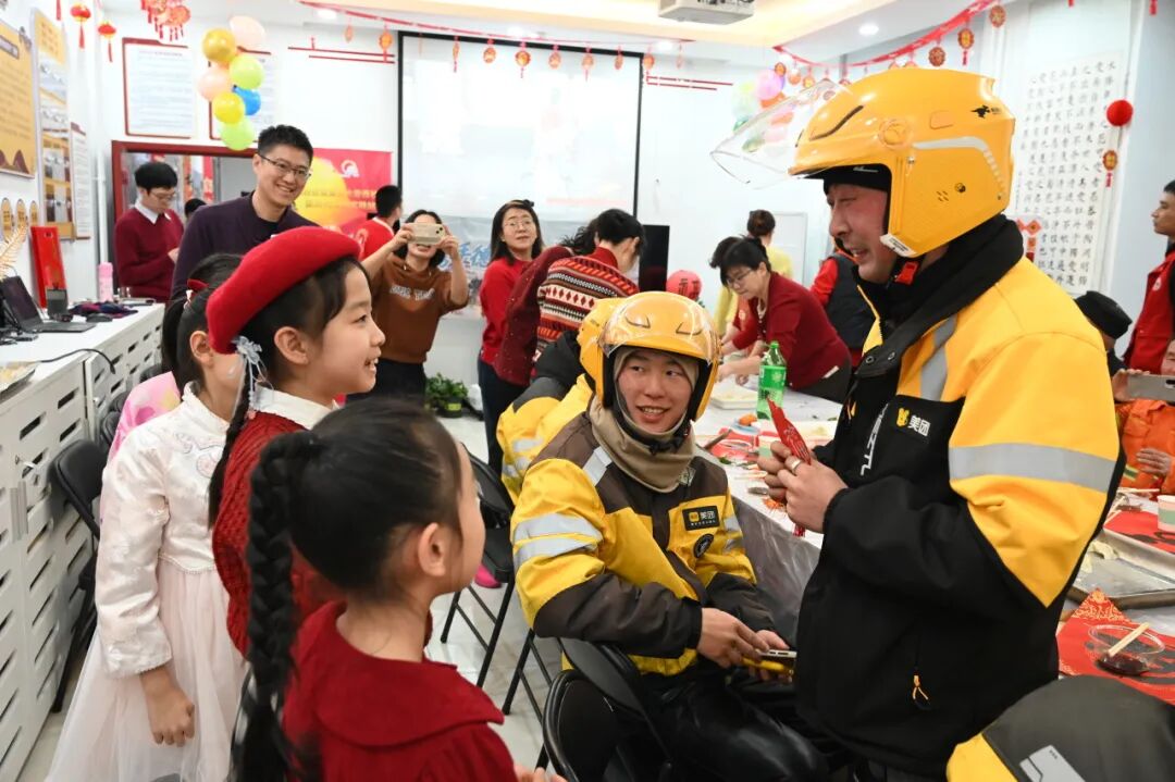 为守护坚守岗位的新就业群体并延续这份善意,德胜街道以“携手德哥润化德胜”党建品牌为引领,精心策划了此次“携手德哥·暖‘新’守岁”活动。活动在多个社区同步开展,温情满满:安北社区的志愿者与社工专程前往临近顺丰站点,为快递小哥们现场包饺子、送新春祝福,与小哥话家常、叮嘱出行安全,将家人般的关怀送到站点、送到小哥心坎上;德外大街西社区则联动辖区友好商户,邀请救人骑手张蒙蒙、其团队中服务德胜的美团骑手,以及春节坚守岗位、无法回家过年的物业、保洁、保安等一线工作人员齐聚社区,一同包饺子、迎新春。