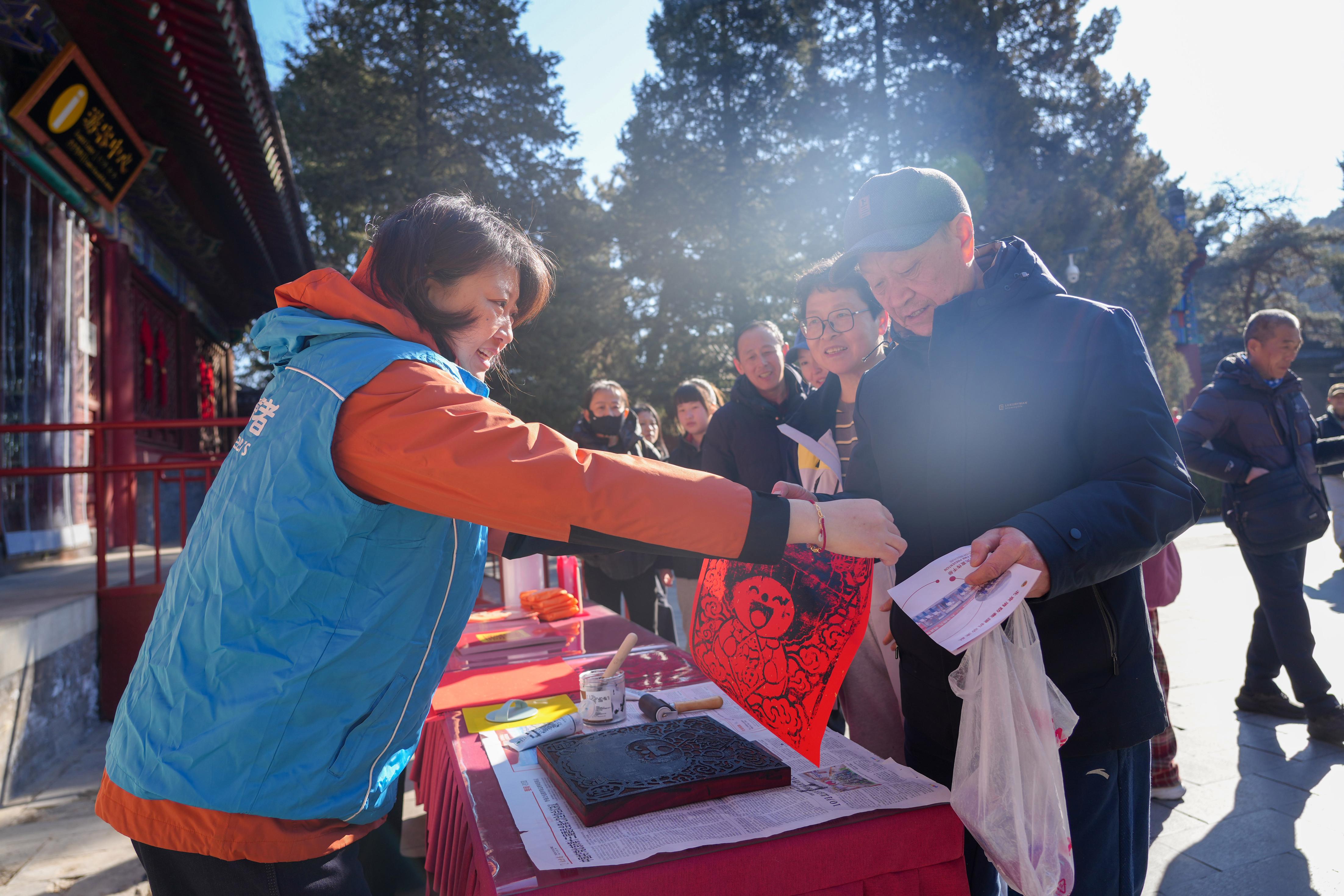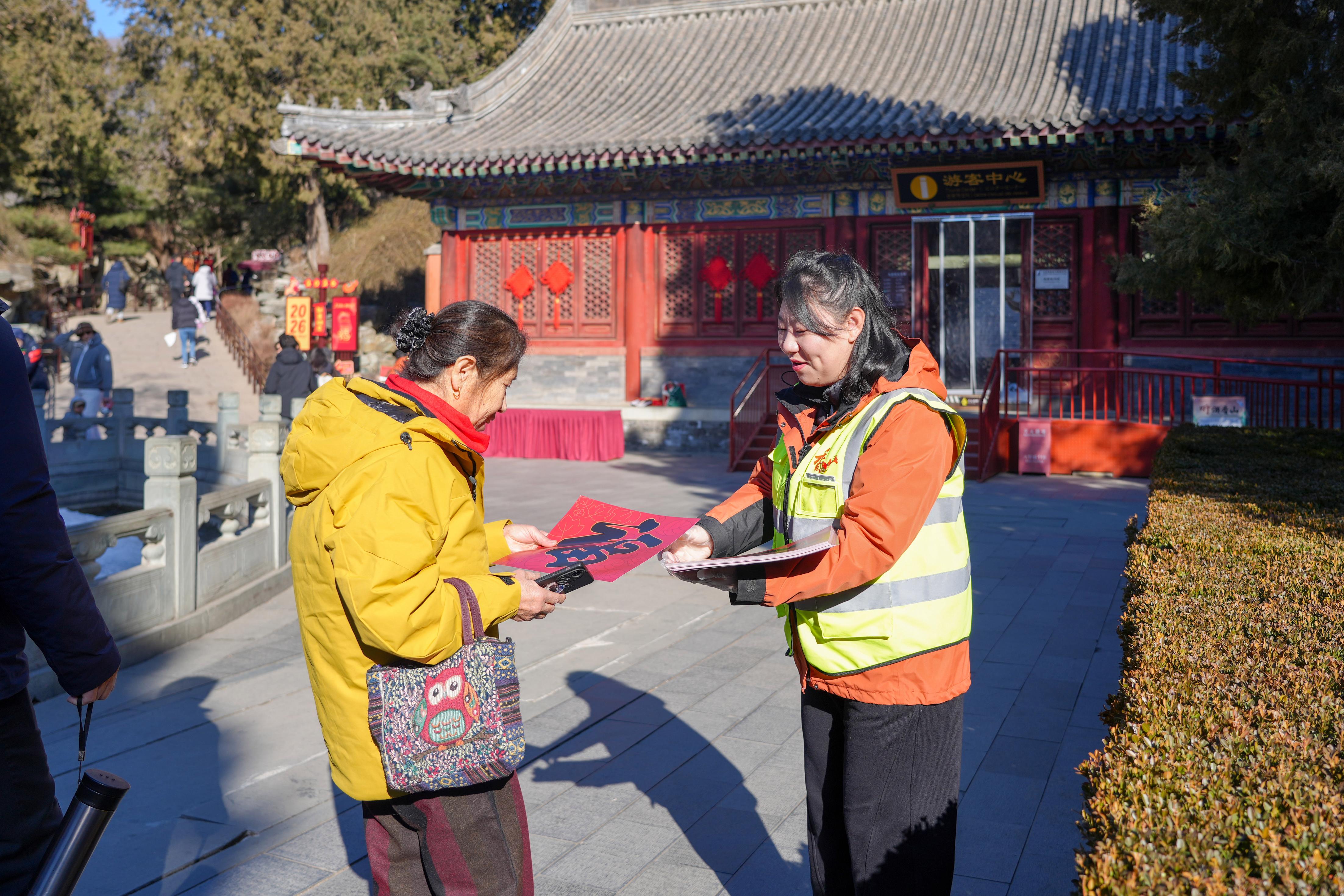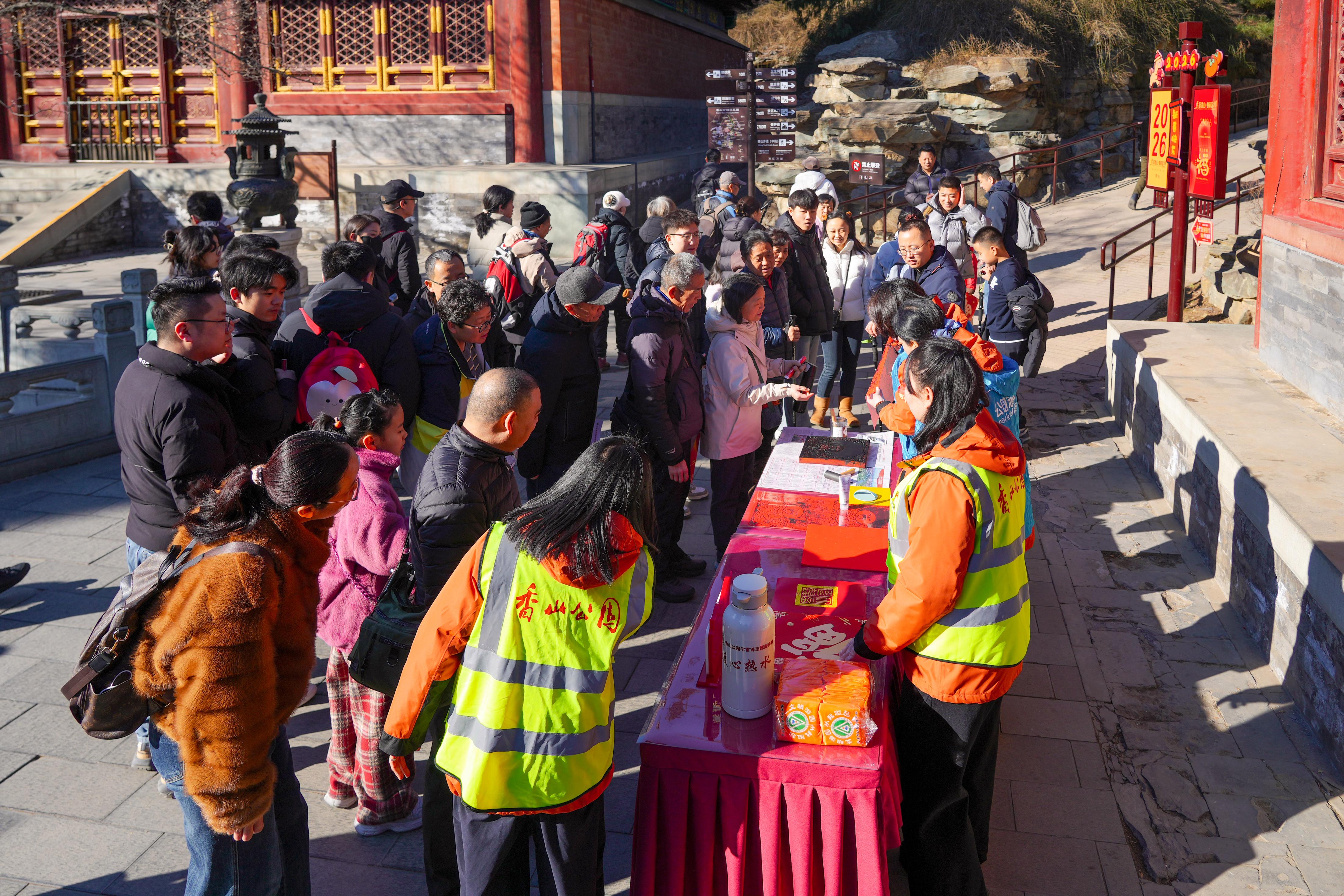 正月初一清晨5点40分,东门工作人员提前开门迎客、送上新年祝福,这一暖心细节被多家媒体点赞。园内6处免费热水供应点、学雷锋志愿服务站的文明引导,以及工作人员现场解答集章疑问等举措,织就温暖服务网。其中,“栌栌马年纳福”木版年画拓印体验,让游客得以将“香山年味”带回家,进一步提升满意度。