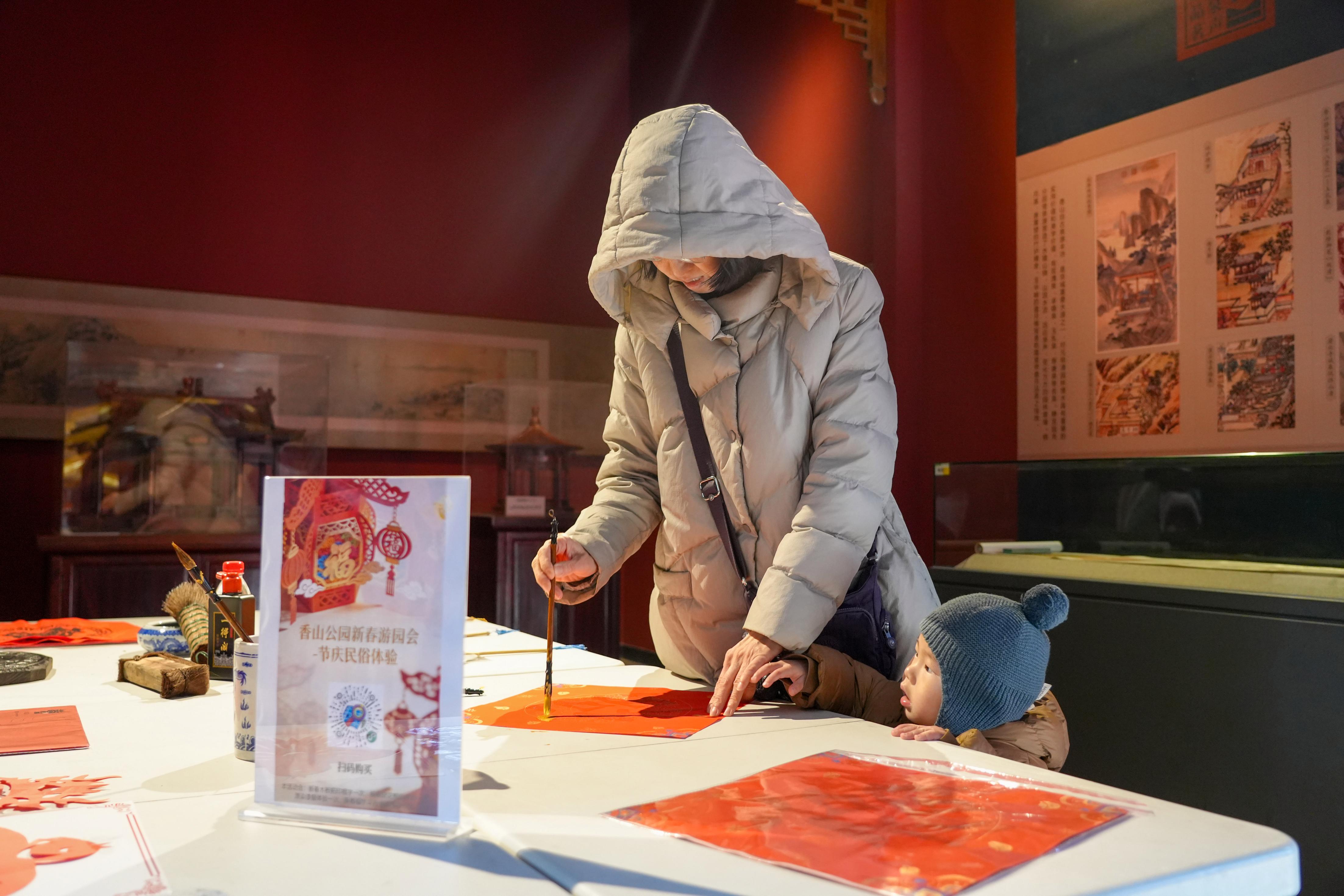 正月初一清晨,香炉峰顶举行日出祈福活动,数百位游客登顶迎接新春第一缕阳光;双清别墅每日9时举行升旗仪式,搭配38场次红色讲解,让游客在游园中感悟革命历史;见心斋200余盆年宵花卉组成的花展、碧云寺茶室内的剪纸互动,尽显年俗雅趣。新春游园会中的五福集章、非遗木板印福、投壶等体验项目,更是深受欢迎,仅“栌栌木板年画拓印”一项就吸引数百组家庭参与,有效延长游客停留时间,带动文创消费增长。