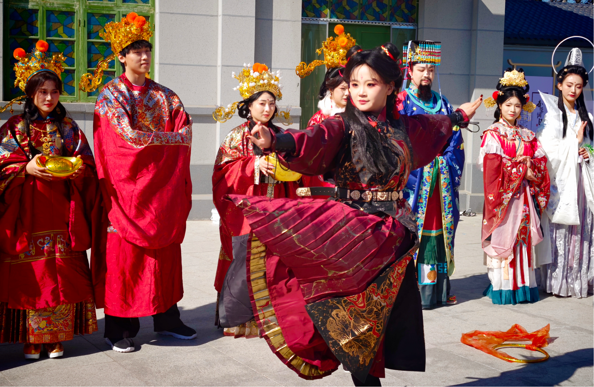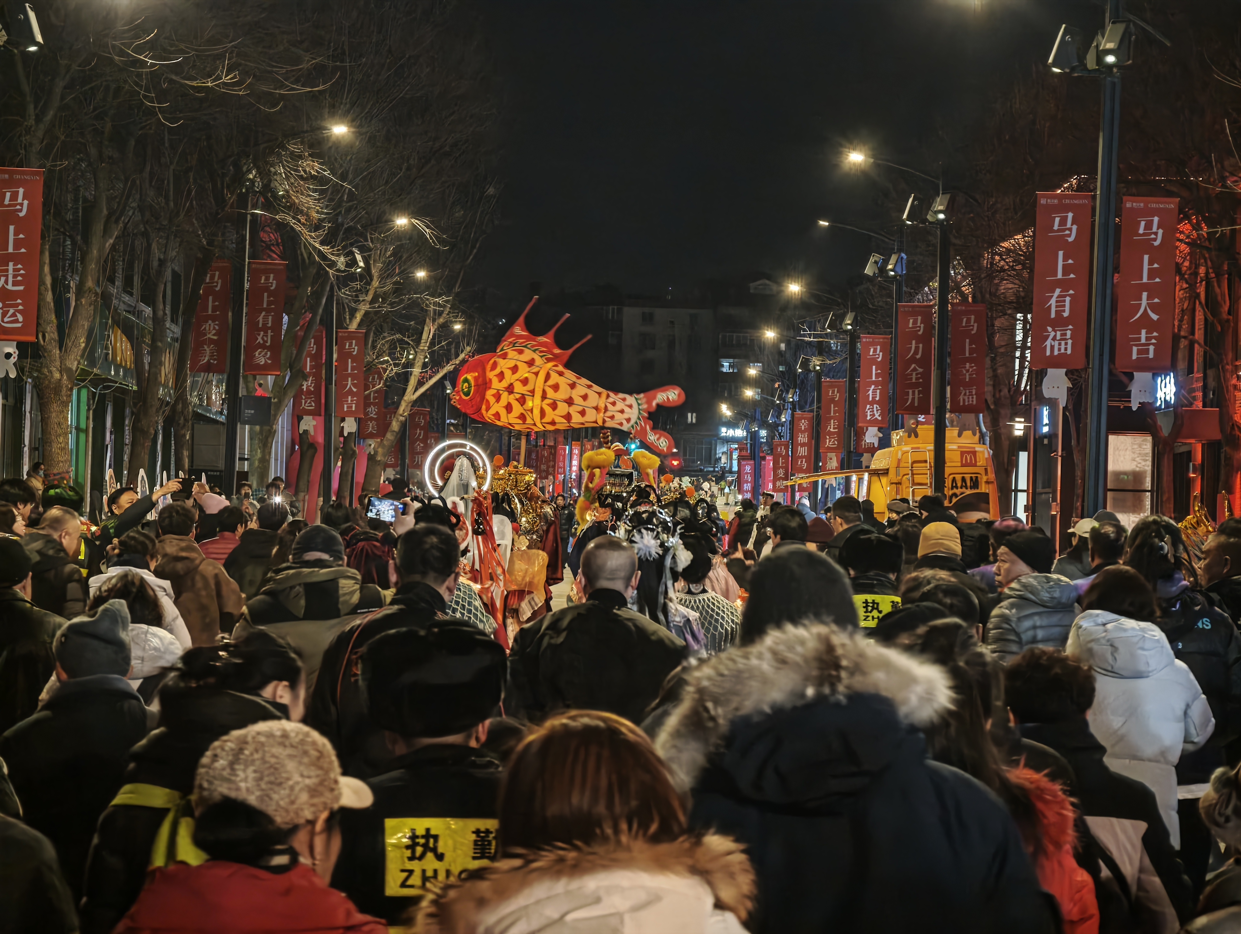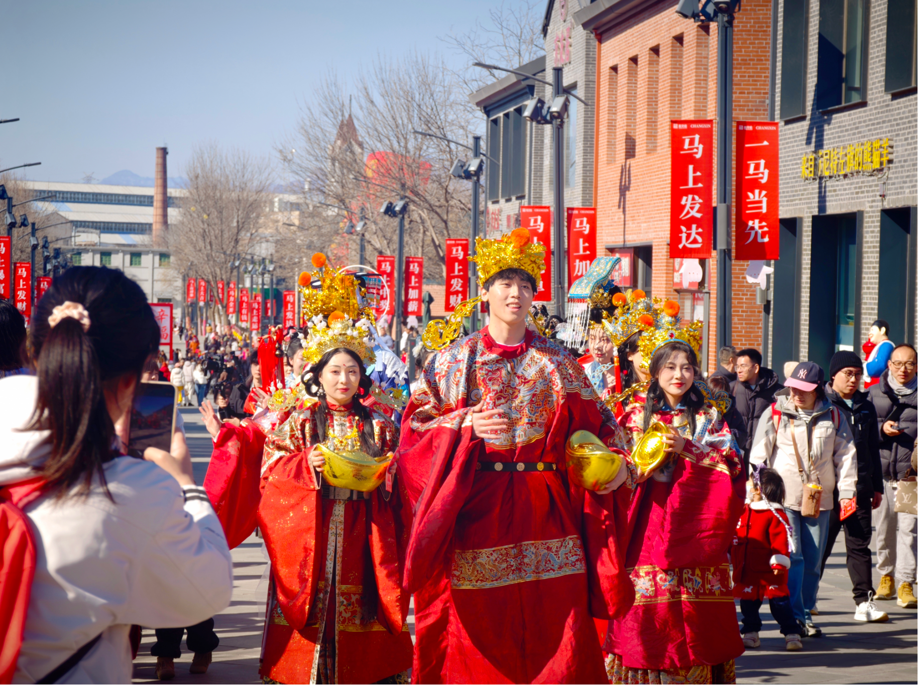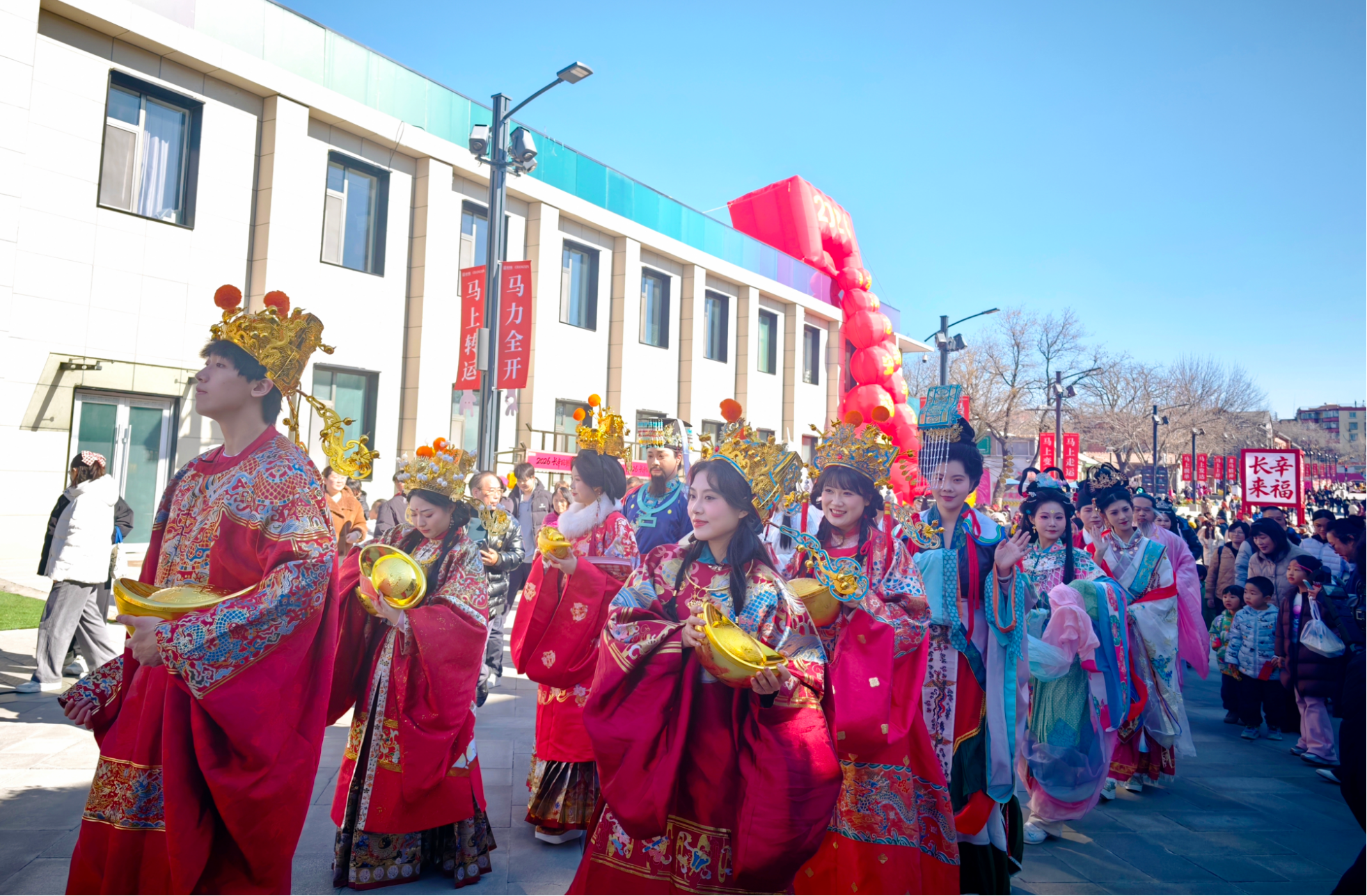“财神爷给我摸摸金元宝!”围观的人群瞬间沸腾,孩子们蹦着高儿往前挤,大人们也顾不上矜持,纷纷伸手想沾沾“仙气”。笑容可掬的“福星”所到之处,大家争相合影;“禄星”头戴华丽官帽,为过往市民送上美好期许;鹤发童颜的“寿星”拄着寿杖,传递健康长寿的祝愿;俏皮可爱的“禧星”身着彩衣,让欢乐一路蔓延;而那位金碧辉煌的“财神爷”,怀里抱着金灿灿的元宝,成了全场人气王。