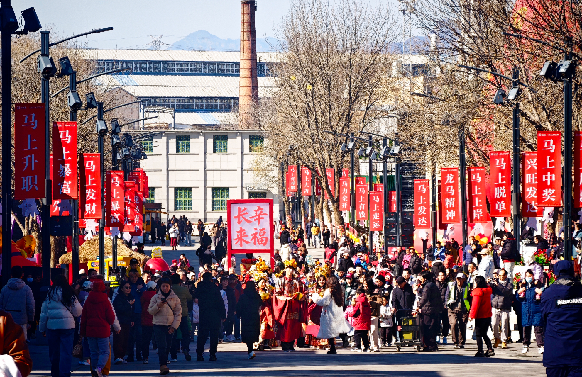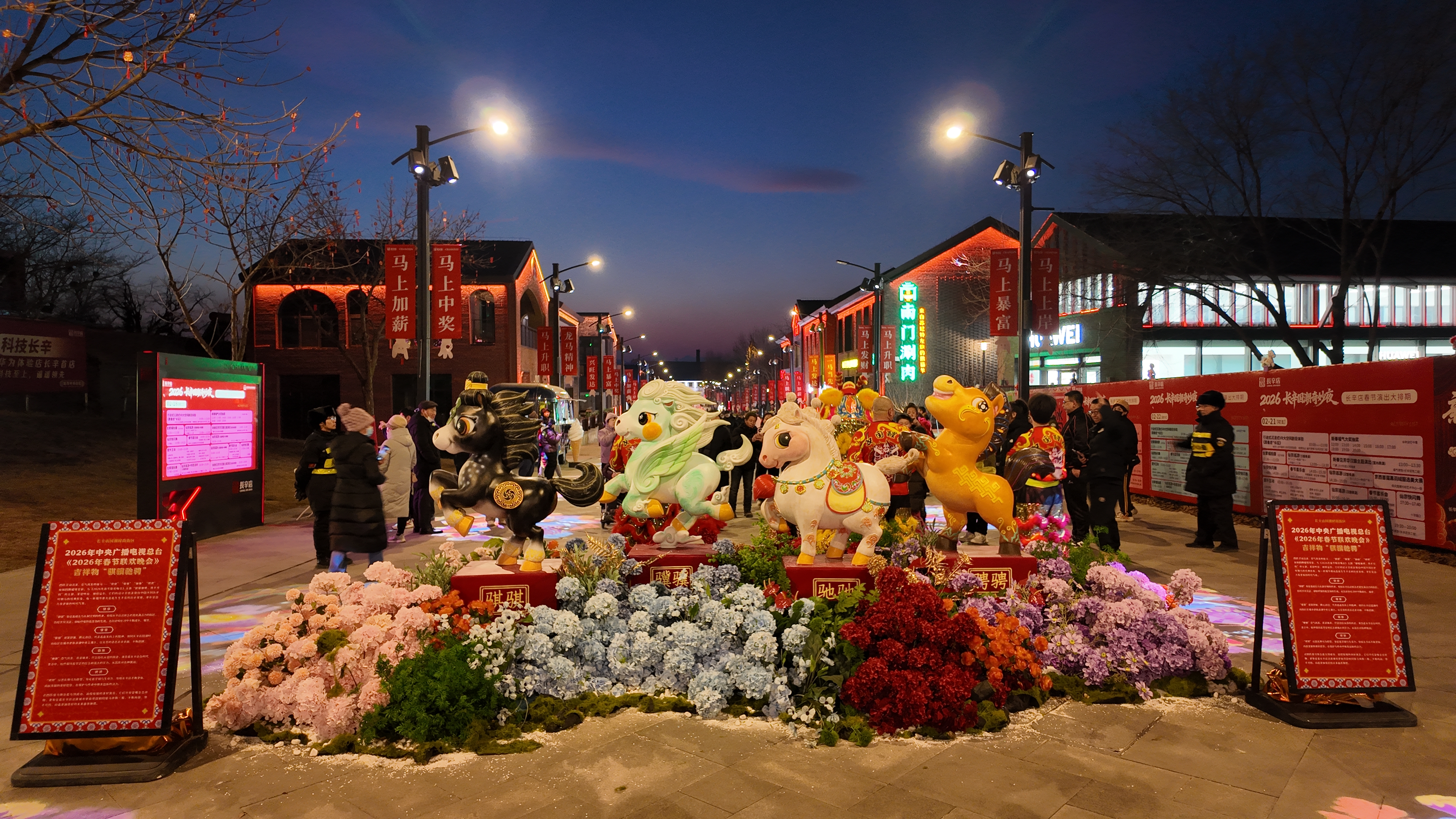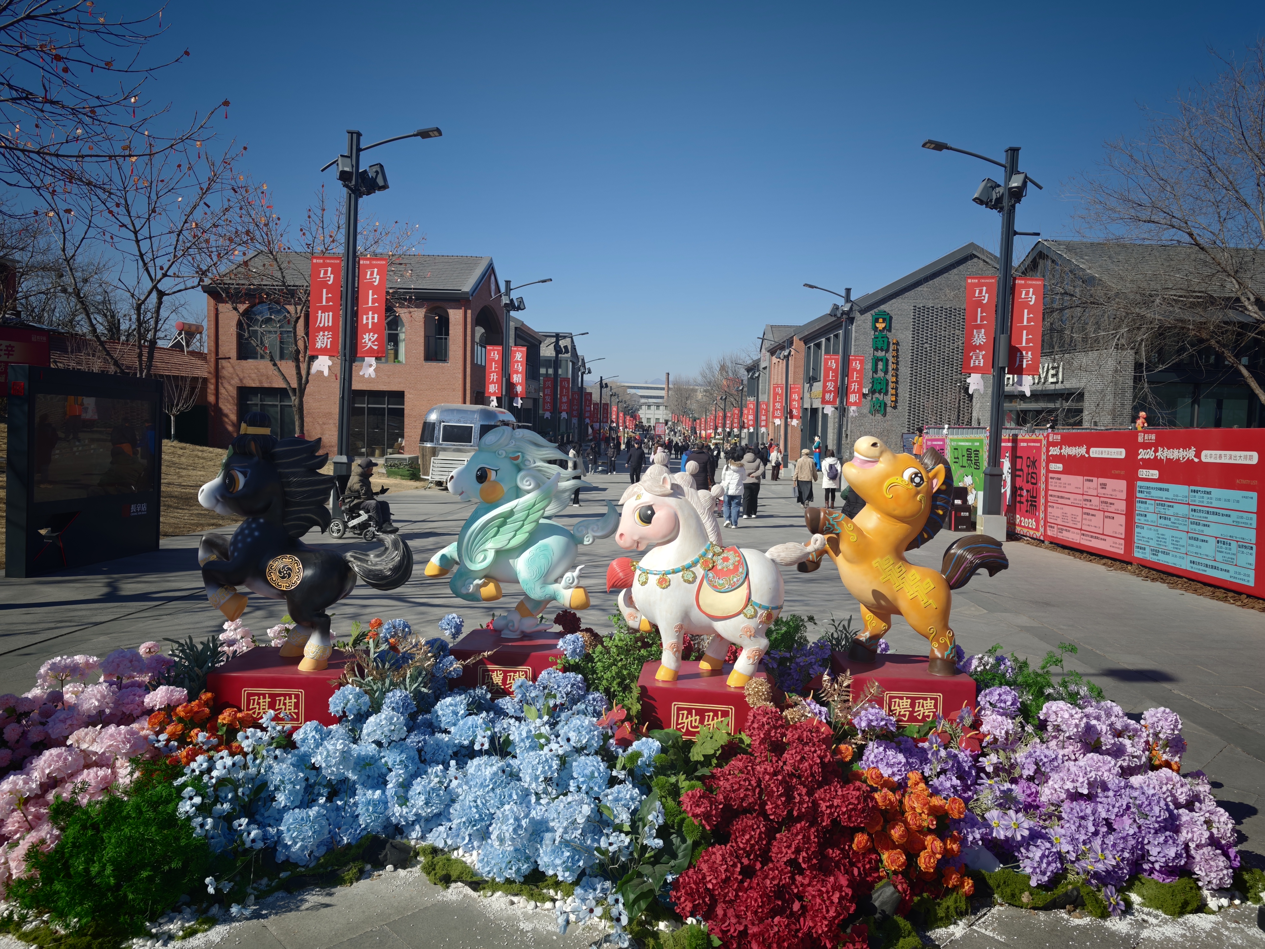 长辛店国潮时尚街区的新春氛围,从踏入曹家口路的那一刻便扑面而来。“快看,这是春晚同款的马!”市民张女士举着手机,指挥着丈夫和孩子调整站位。在她身后,四匹总台2026年春晚吉祥物“骐骥驰骋”小马装置伫立在入口处,成了街区最亮眼的“门面担当”。沿街望去,新换的春节主题道旗随风摇曳,一处又一处特色打卡景观散落街头,让长辛店的新春有了别样的韵味。