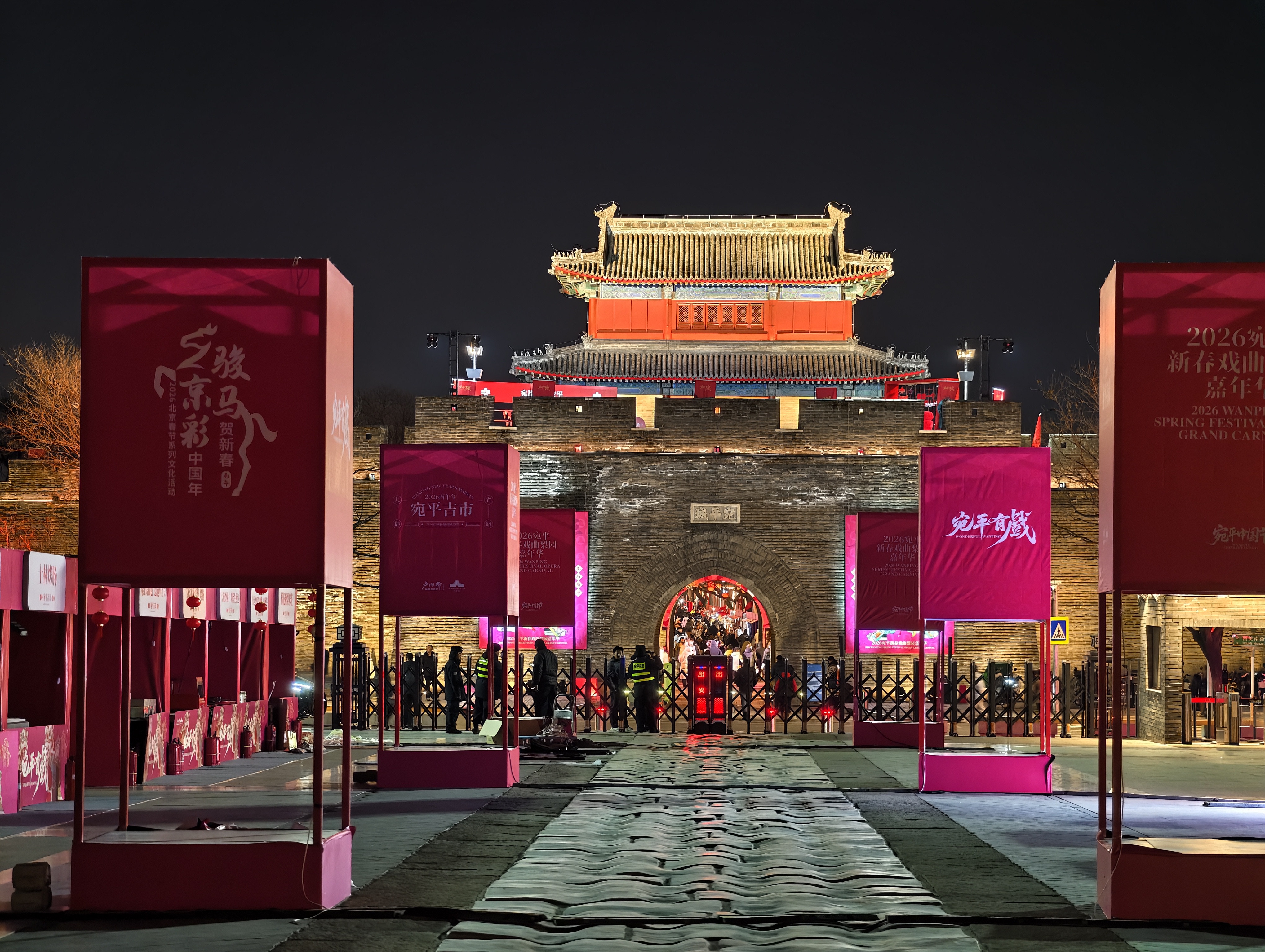 晚6时,随着2026宛平新春戏曲梨园庙会热闹进行,宛平城城墙景观灯全部点亮。至此,中国人民抗日战争纪念馆、卢沟桥、宛平城、永定河滨水空间——“馆桥城园”四大核心要素点在同一时刻全部亮起,暖黄色的灯光勾勒出古城轮廓,与冰封的永定河交相辉映,标志着京西历史文化地标群正式开启“夜游模式”。