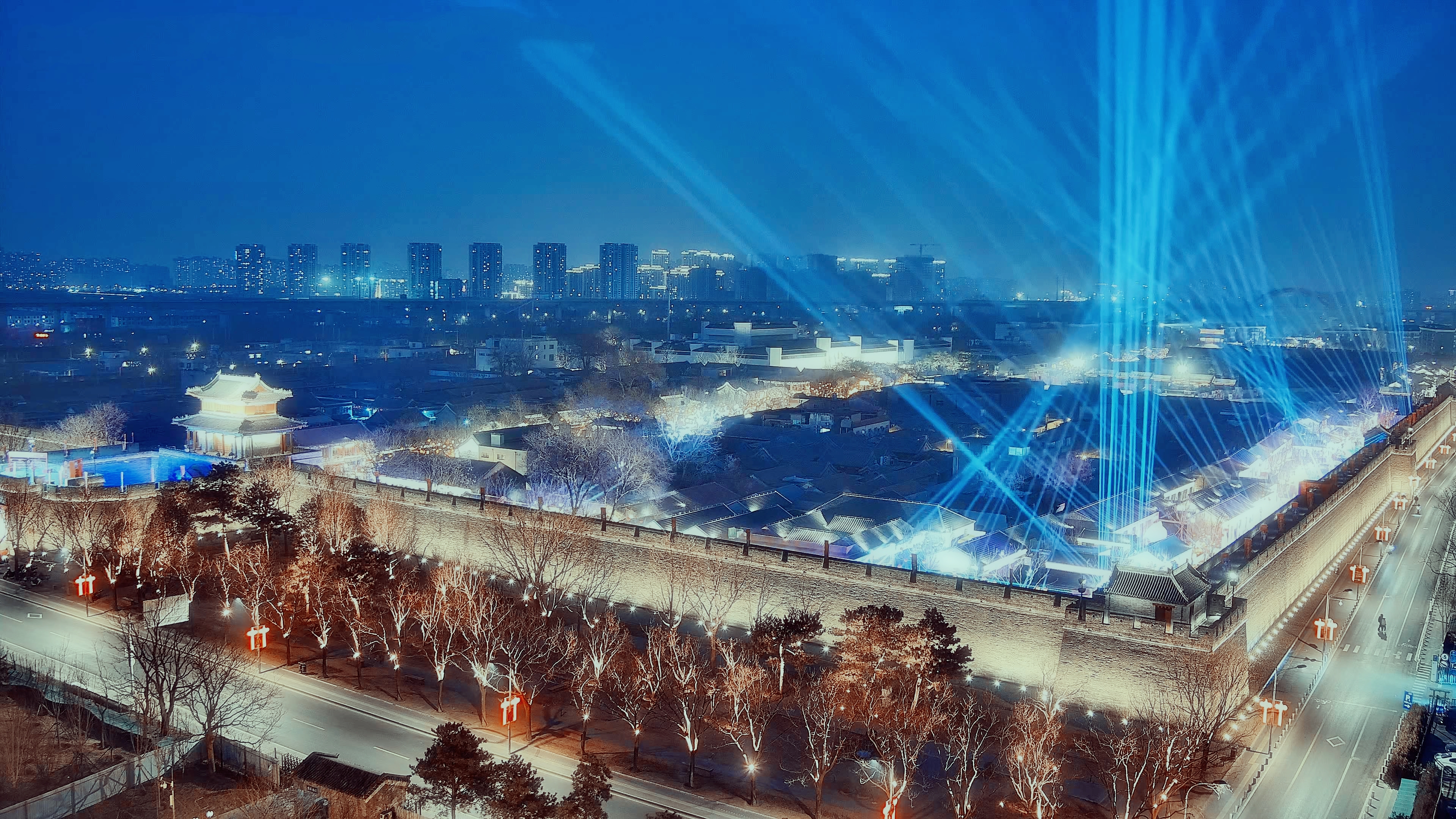 贯穿东西大街的数千盏灯笼与城墙上的投光灯同步点亮,将整座古城装点得流光溢彩。依托西南垣城墙设置的西游主题实景剧本杀《戏游记》中,30位真人NPC在灯光下与游客互动,古老的城墙成为沉浸式演出的天然幕布。