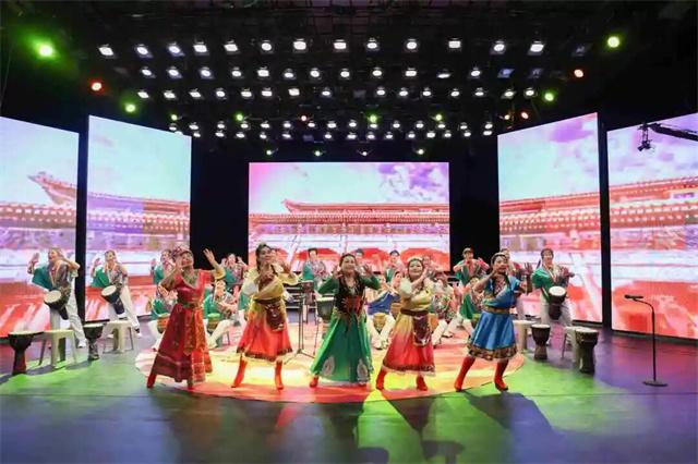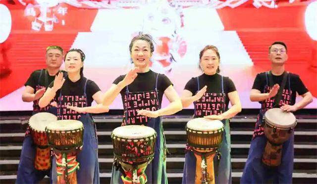 由威海市老年大学呈现的非洲鼓《旗开得胜》,节奏激昂、鼓点铿锵,带动全场热烈气氛。
